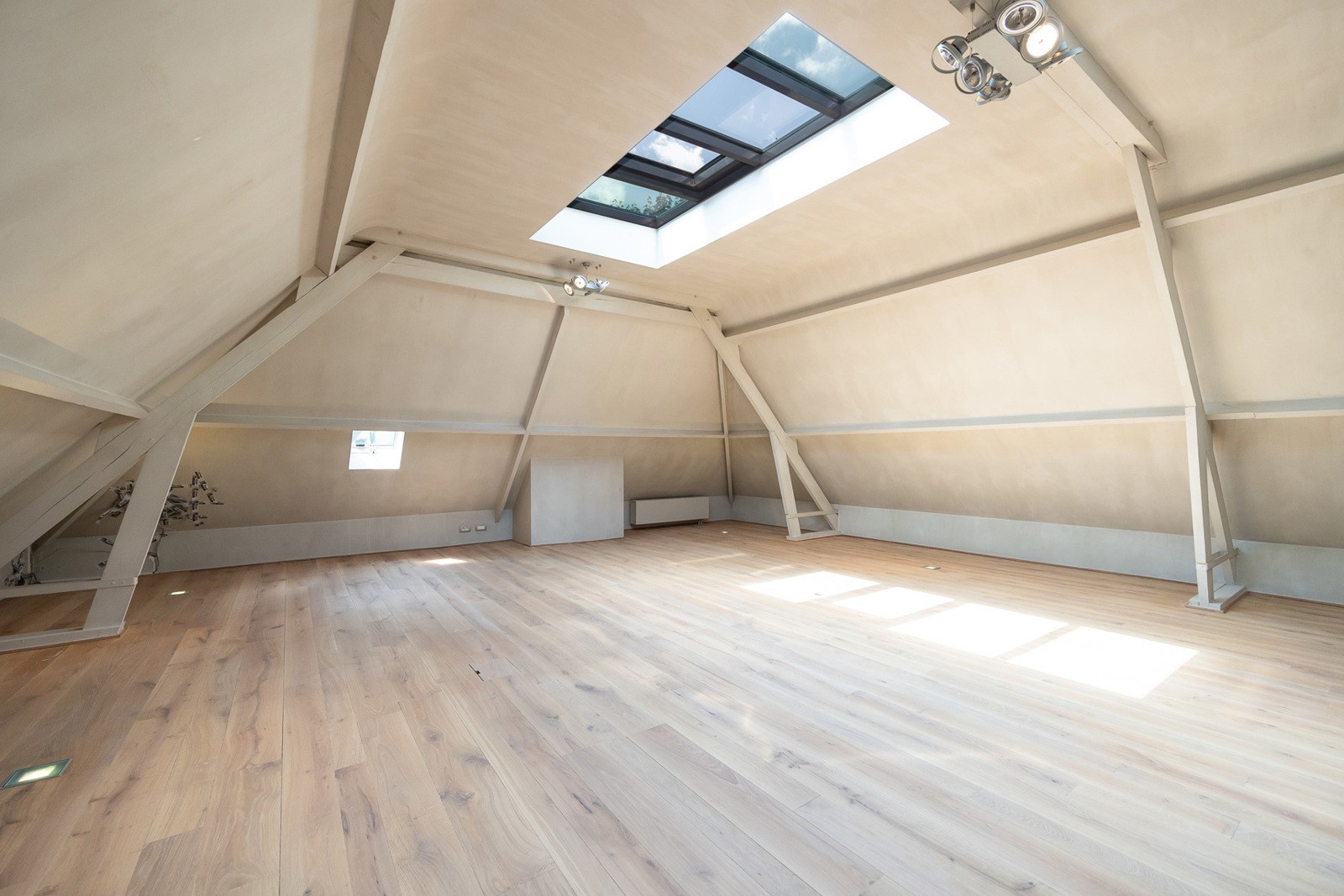 Op de tweede verdieping bevindt zich een uitzonderlijk grote ruimte van 90m² op parket, alsook een zolderruimte van 40m² met technische voorzieningen.