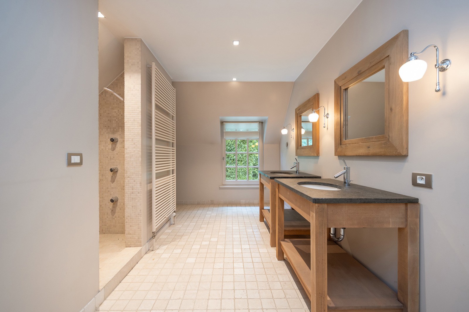 De overloop van 20m² op parket geeft toegang tot twee slaapkamers van respectievelijk 22m² en 27m², beiden op parket en voorzien van ingemaakte kasten. De tweede badkamer van 16m² op tegel beschikt eveneens over een dubbele lavabo, inloopdouche en toilet.