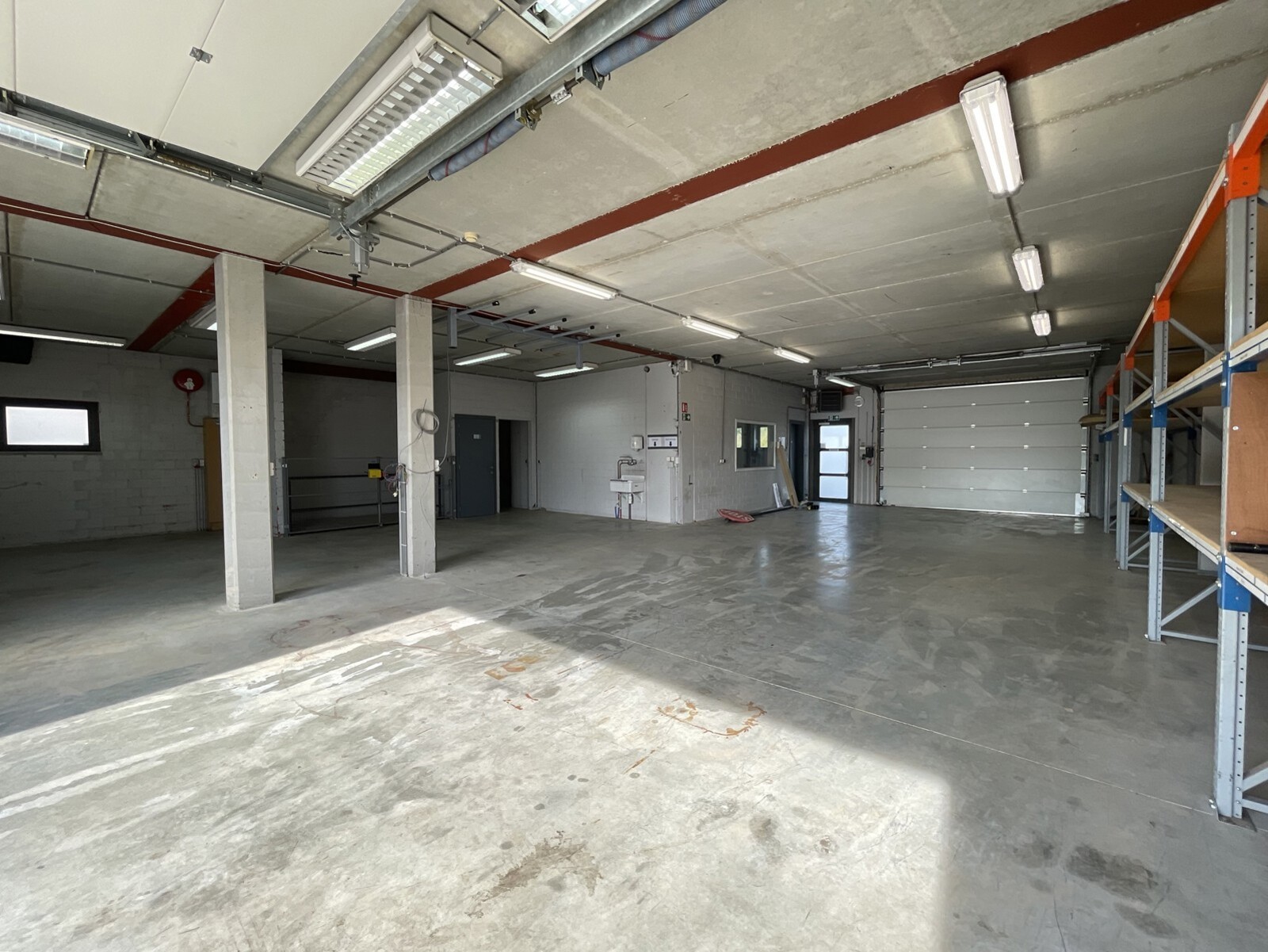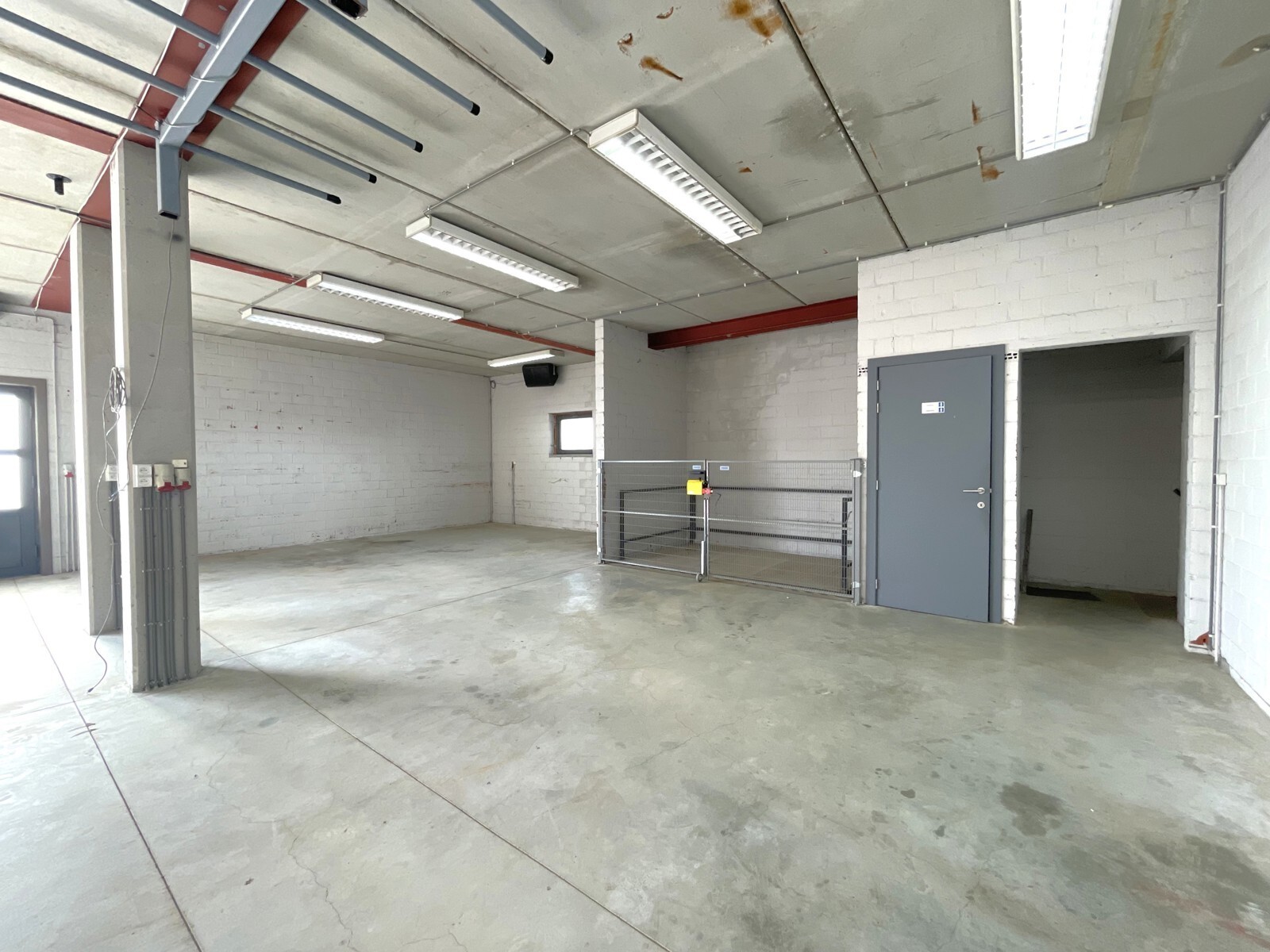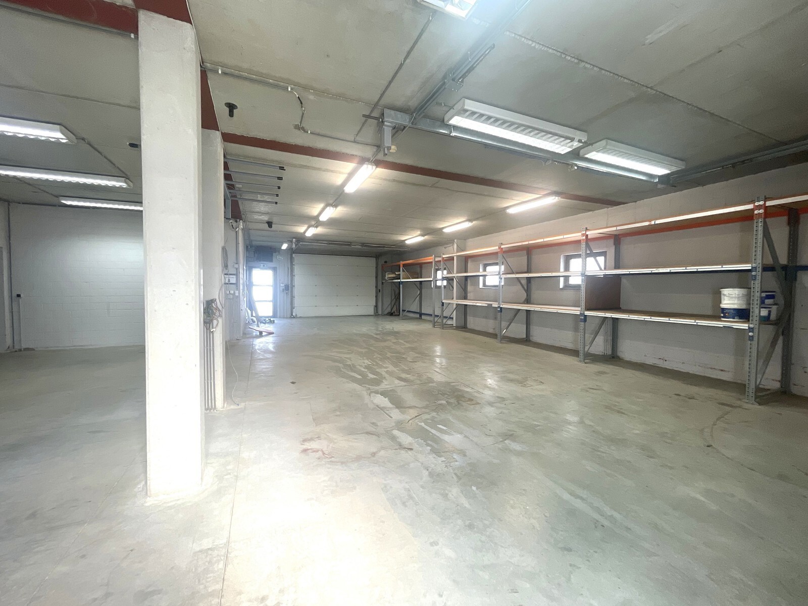 Magazijn met bureel op betonvloer 220 m². Dubbele sectionale poort (4.00m breed). Apart toilet.