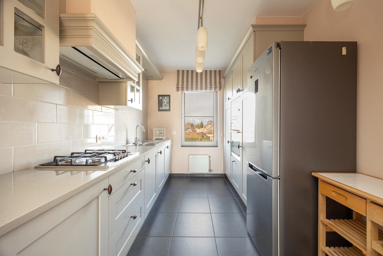 Keuken ca. 8m², voorzien van gasvuur, oven, microgolfoven en koelkast met vriesvak.