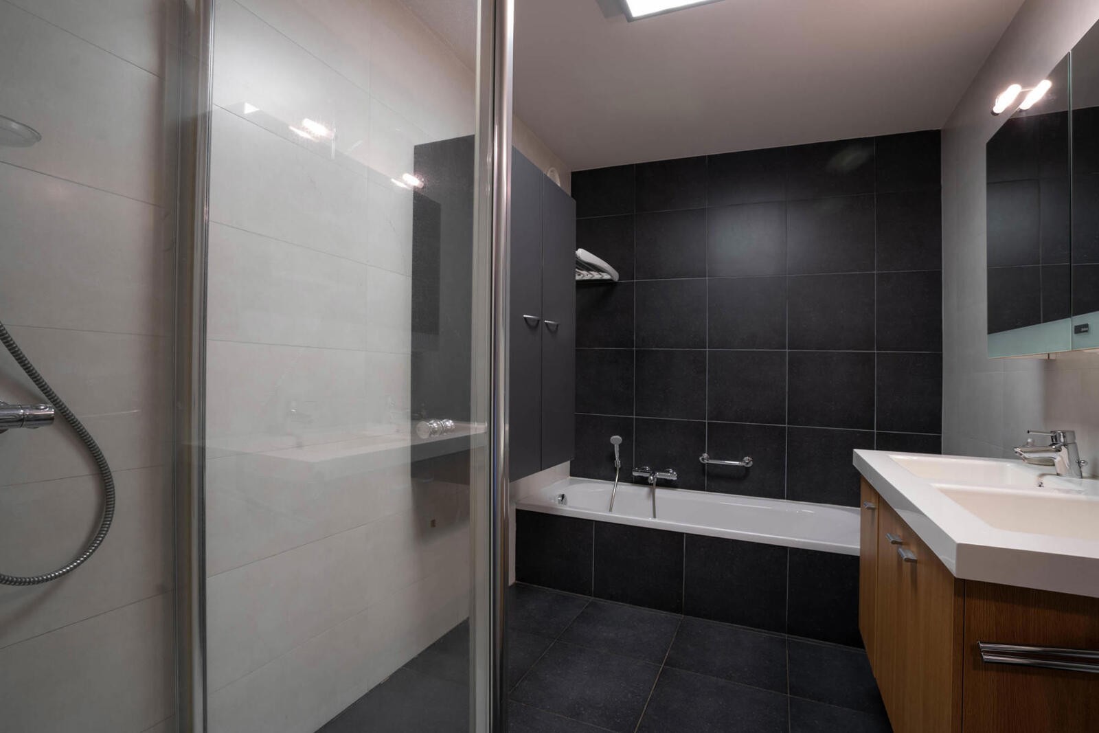 Ruime badkamer ca. 8m² op tegel met dubbel lavabo, ligbad en douche. Apart gastentoilet met handenwasser.