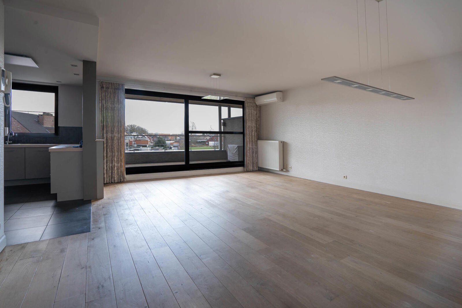 Leefruimte ca. 57m² op volle parket met airco installatie en veel lichtinval door het extra grote schuifraam.