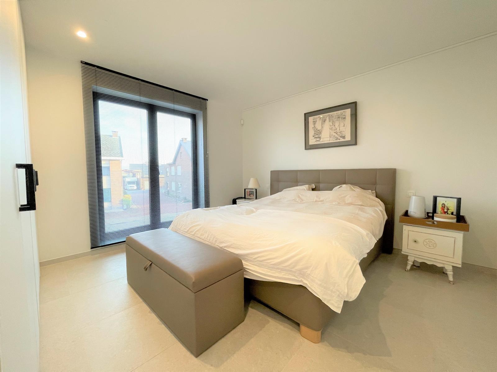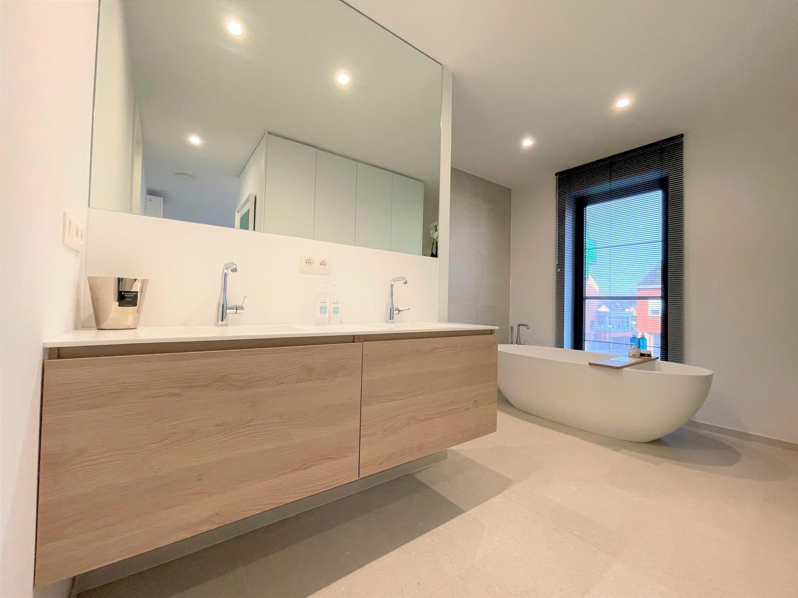Ruime slaapkamer 16 m² op tegel met ingemaakte kasten en airco. Ensuite-badkamer 12 m² met ingemaakte kasten, vrijstaand ligbad, inloopdouche, enkele lavabo in design-wandmeubel.