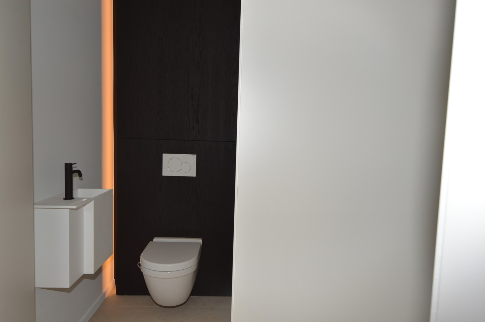 • De strakke badkamer met inloop/ regendouche, enkel lavabomeubel, spiegel- en opbergkasten.