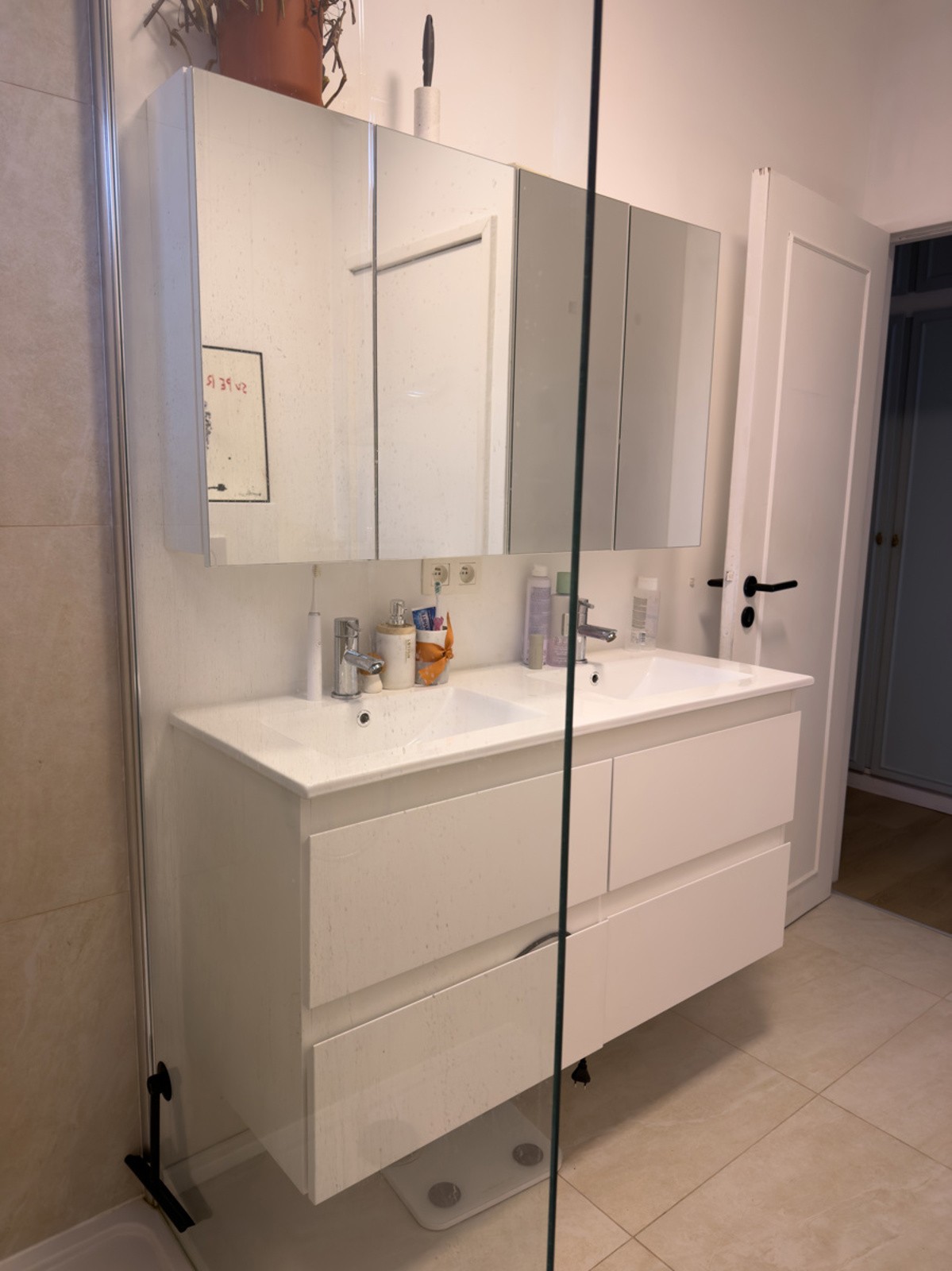 Badkamer op tegels, uitgerust met een inloopdouche en dubbele wastafel