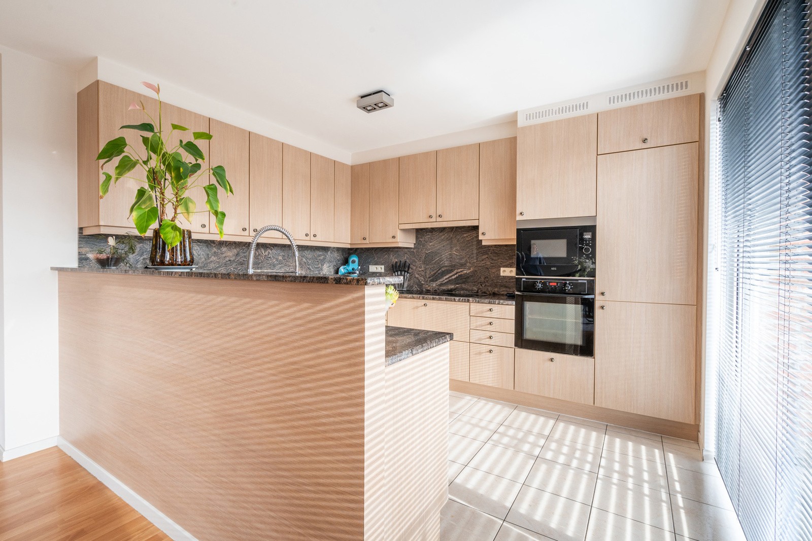 De keuken is voorzien van koelkast, vriezer, microgolf, oven, vaatwasser en 5 pits keramische kookplaat.