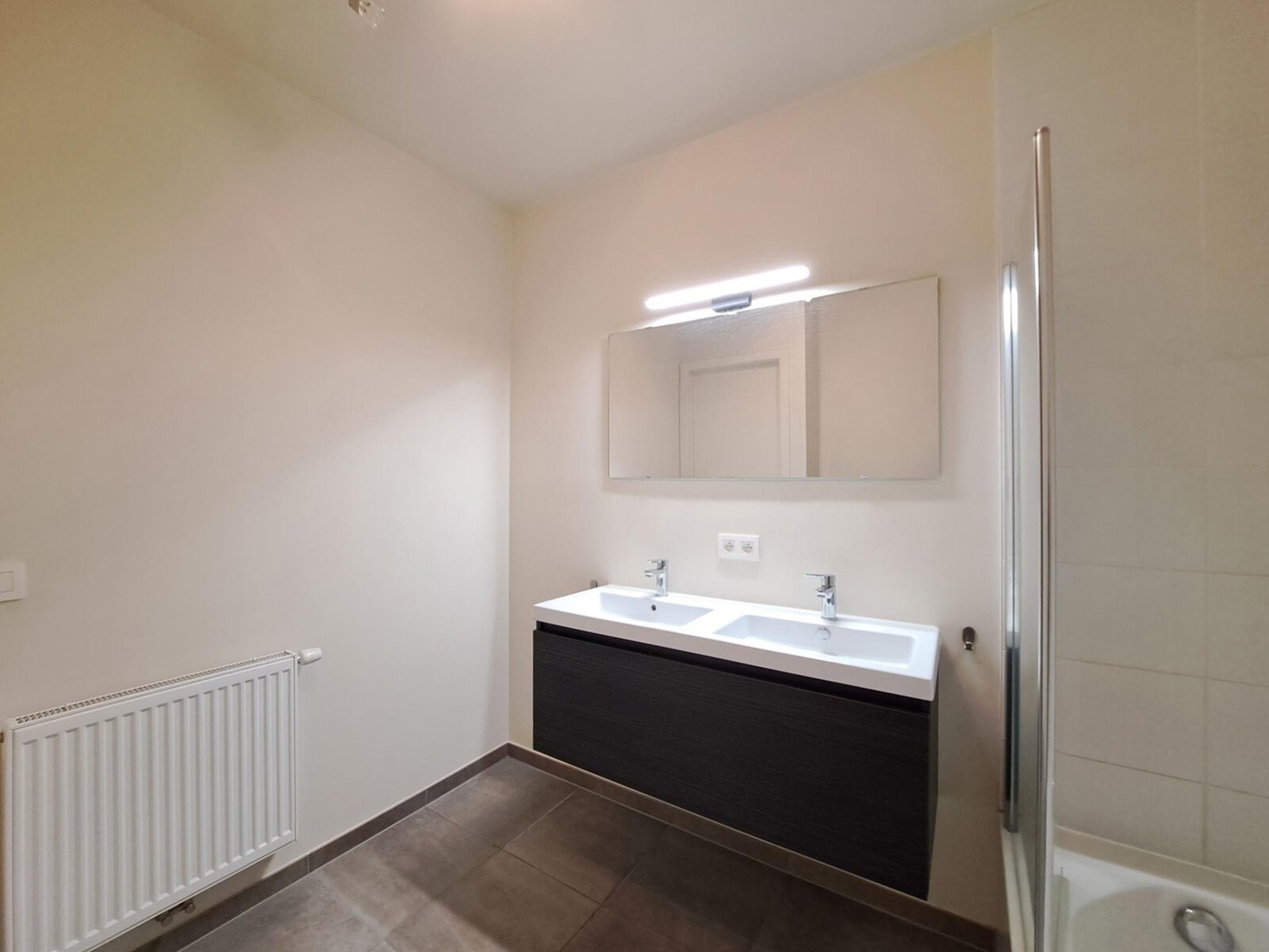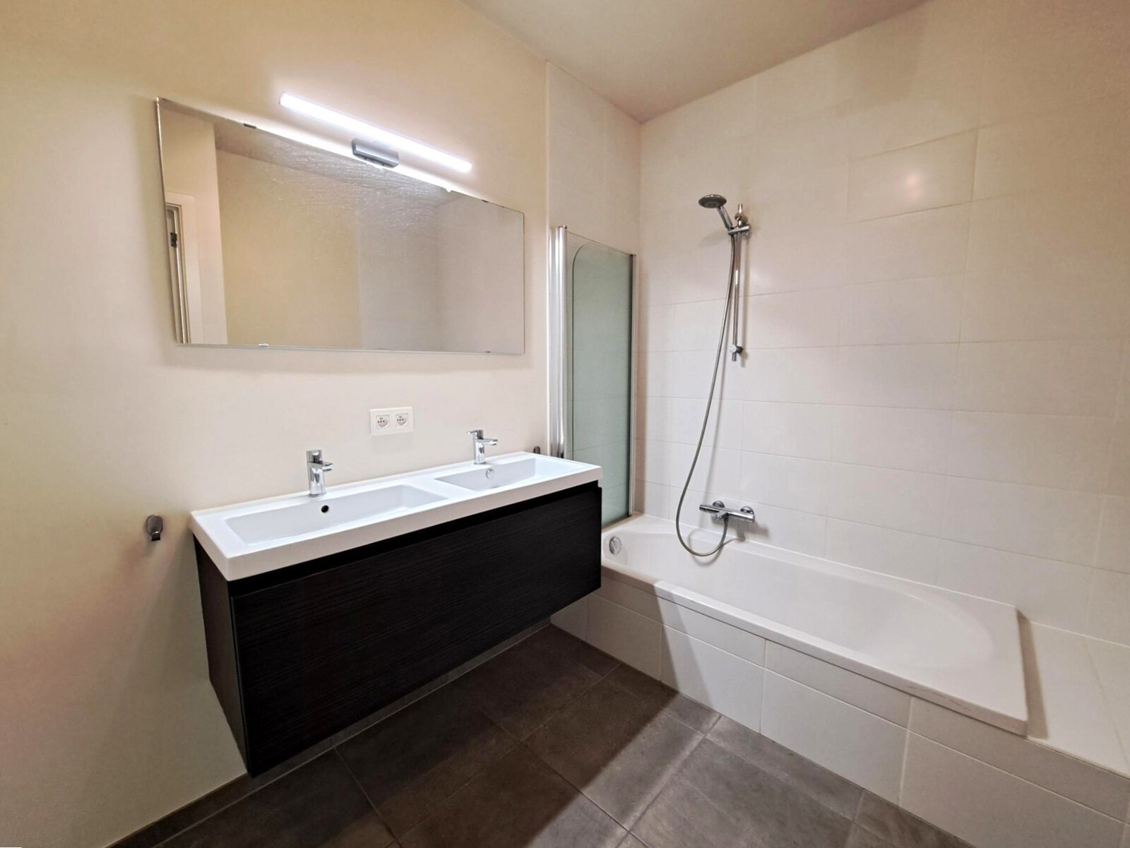 Badkamer met douche in bad en dubbel lavabomeubel.