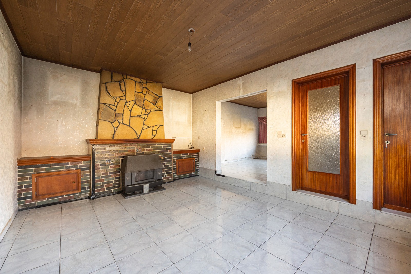Inkomhal 5 m² op tegel. Leefruimte 33 m² op tegel met mazoutkachel. Zithoek 12,5 m² op tegel met enkele lavabo. Keuken 13 m² op tegel met keramische kookplaat, oven, dampkap “Novy”, dubbele spoelbak en bovenblad in natuursteen. Veranda 6 m² op tegel.