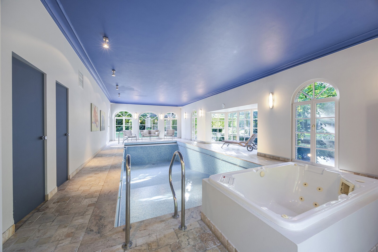 Aan de zuidkant van de woning bevindt zich het riante binnenzwembad met zicht op de tuin. De aanwezigheid van een sauna, doucheruimte en jacuzzi kan hier de nodige ontspanning bieden.