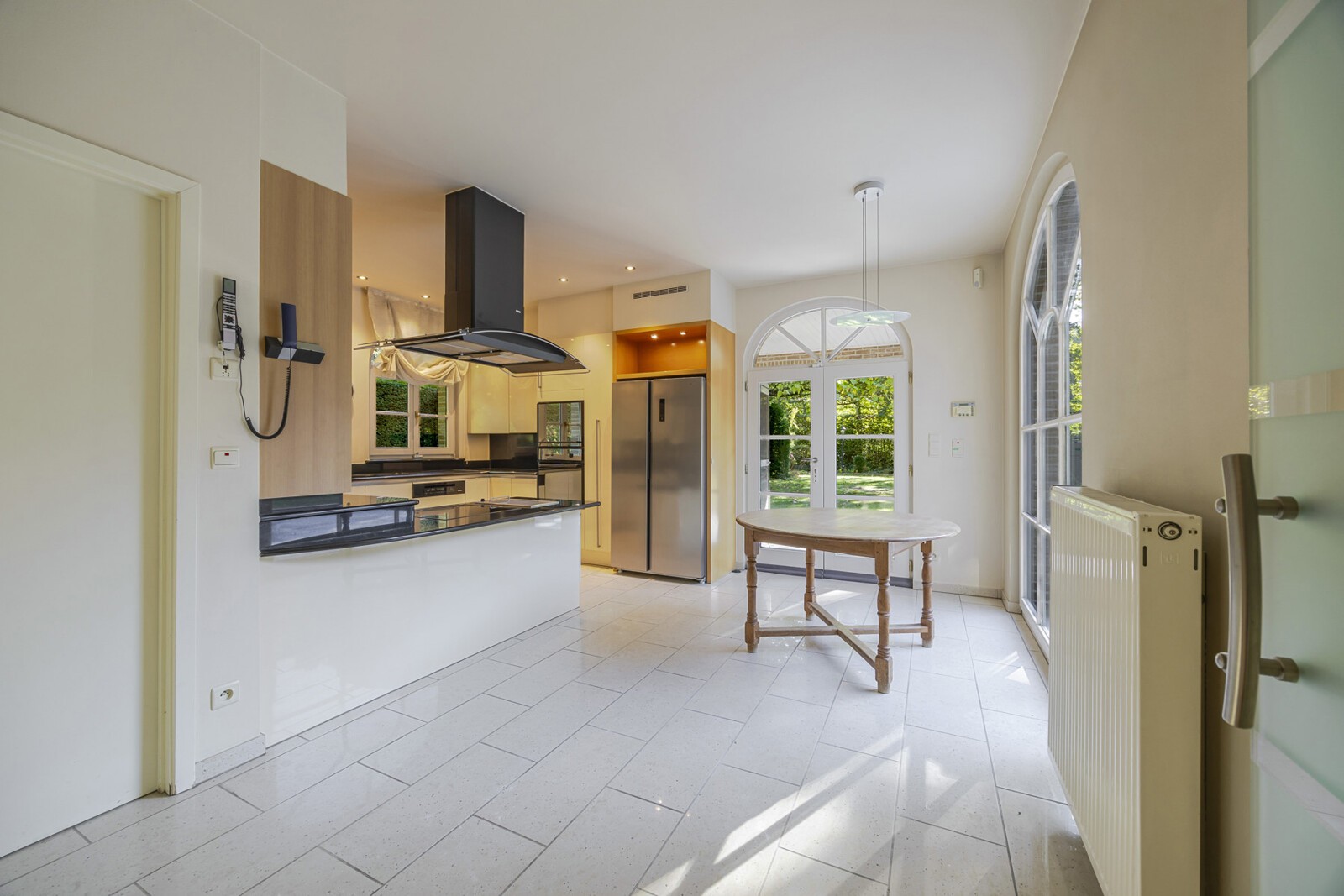 Aansluitend is er de volledig ingerichte leefkeuken (19,76m²) met alle nodige toestellen (Amerikaanse koelkast, oven, vaatwasser, kookplaat, ingebouwde friteuse, dampkap). De achterdeur verleent doorgang tot het aanpalend (overdekt) terras met royaal zicht op de tuin.