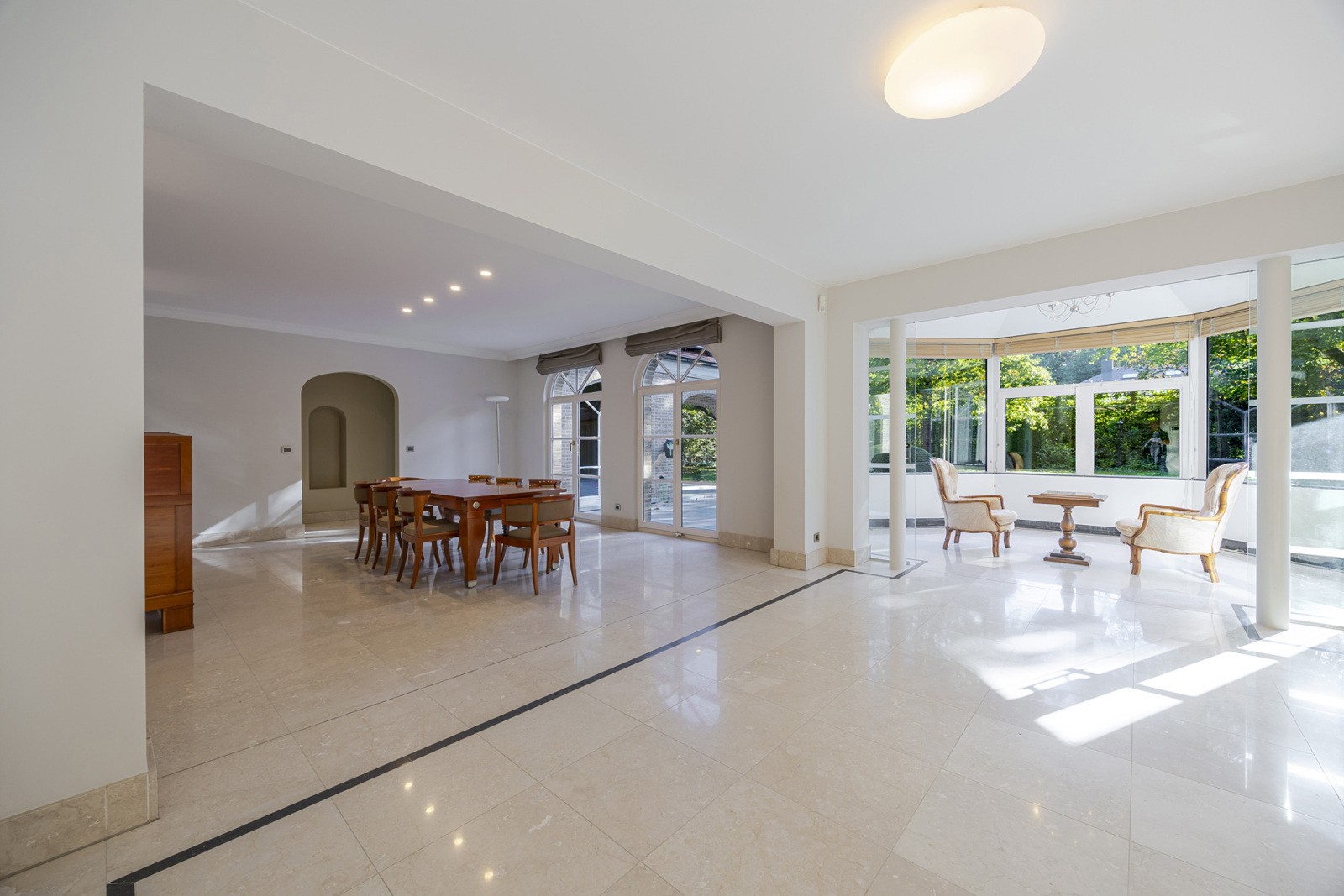 De ruime inkomhal met vestiaireruimte en gastentoilet mondt uit via een dubbele deur, tot de lichtrijke woon- en eetkamer (71,60m²) met zicht op de prachtige tuin.