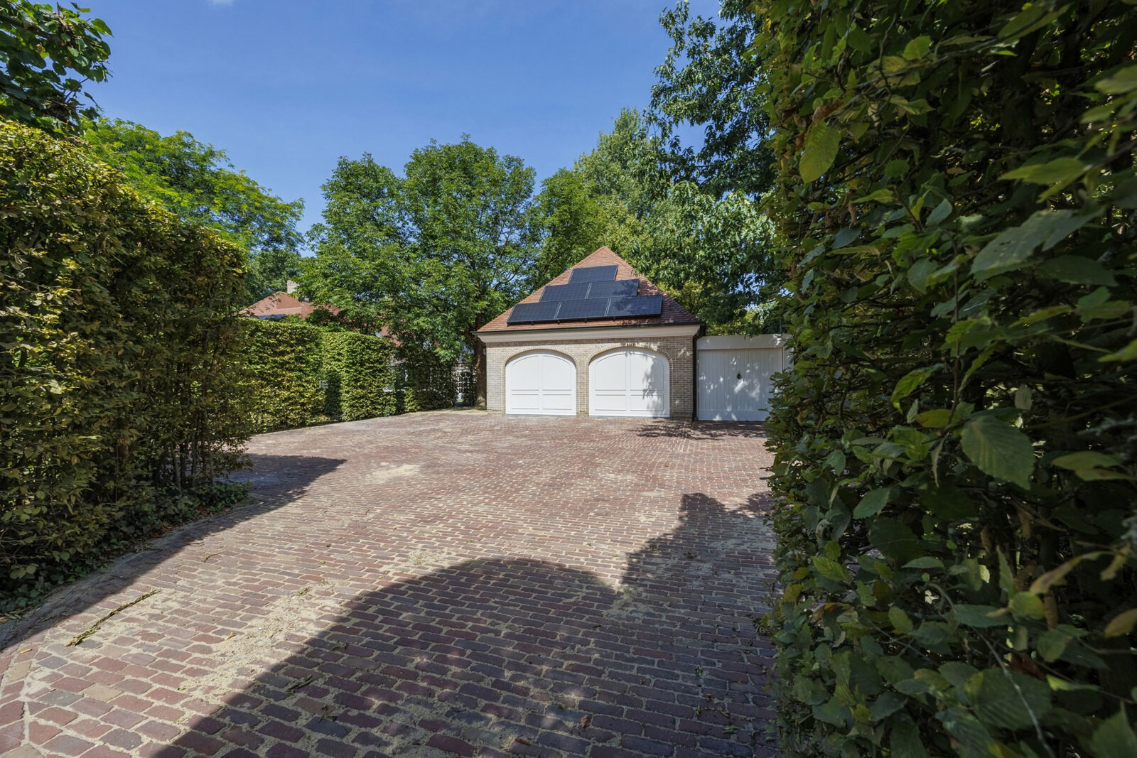 Achteraan de tuin beschikt men over een dubbele garage met automatische poort, dewelke plaats voor 2 wagens biedt.