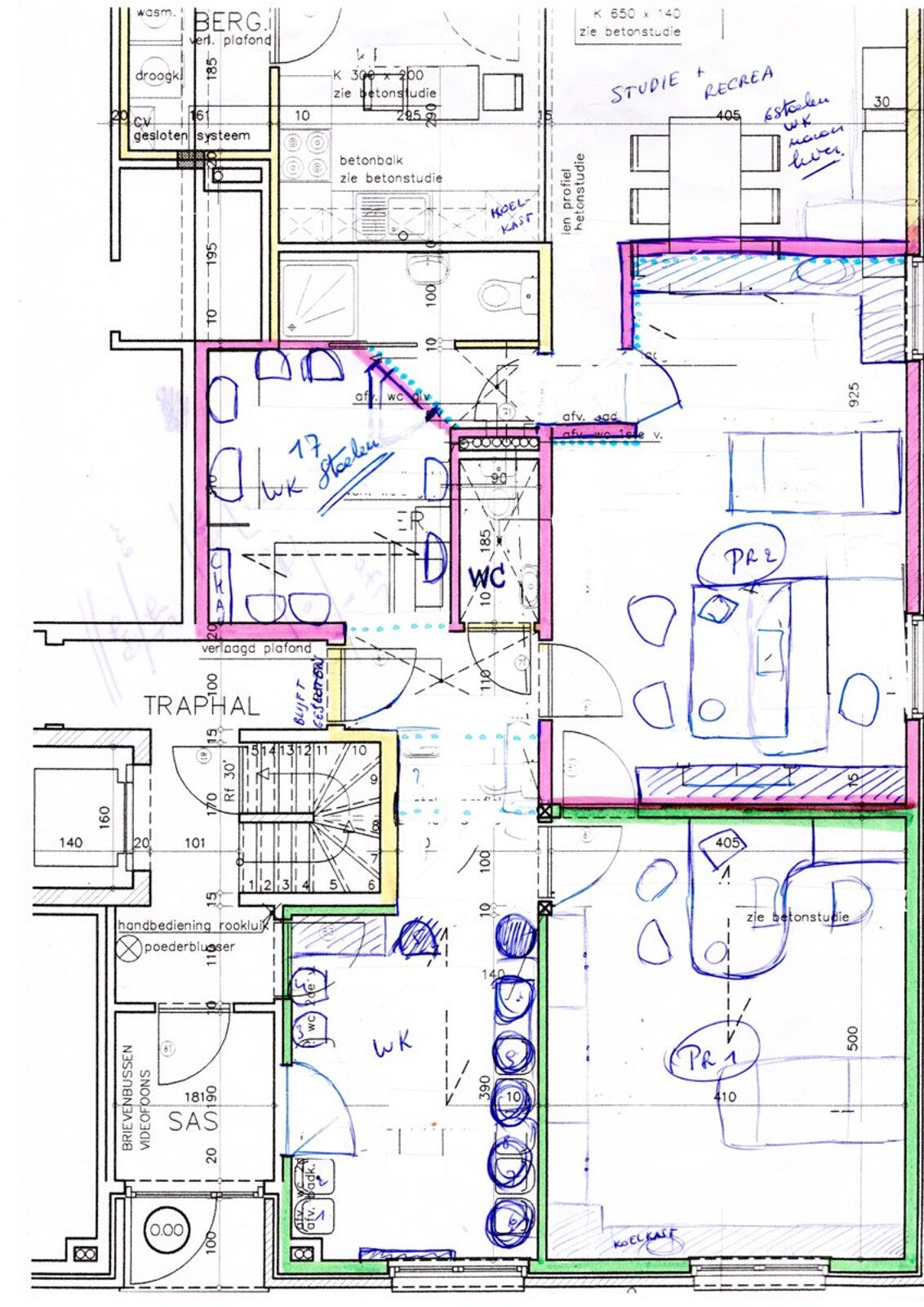 Aansluitend een 2de praktijkruimte (ca. 25m²), eveneens met wachtruimte (ca. 8m²).