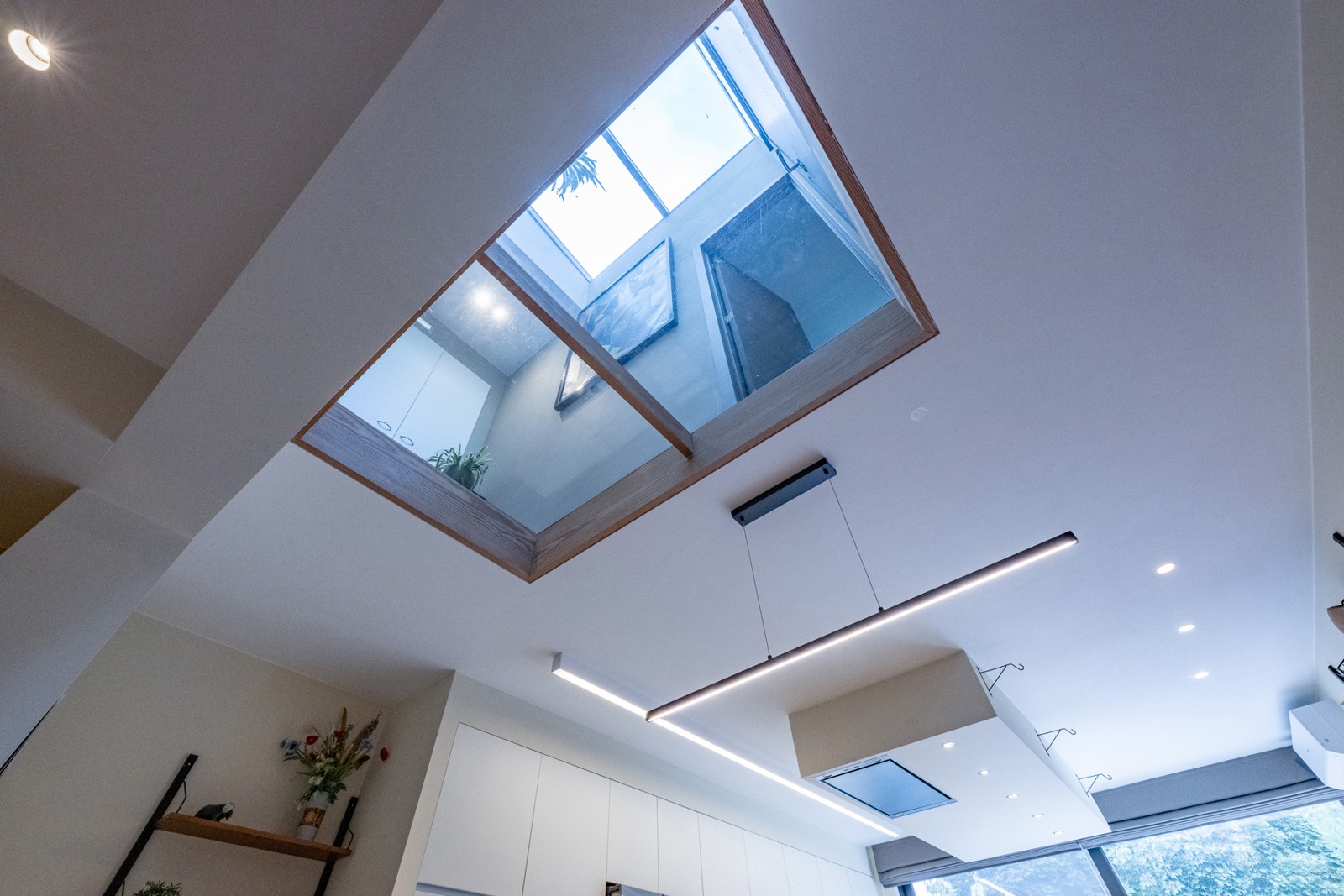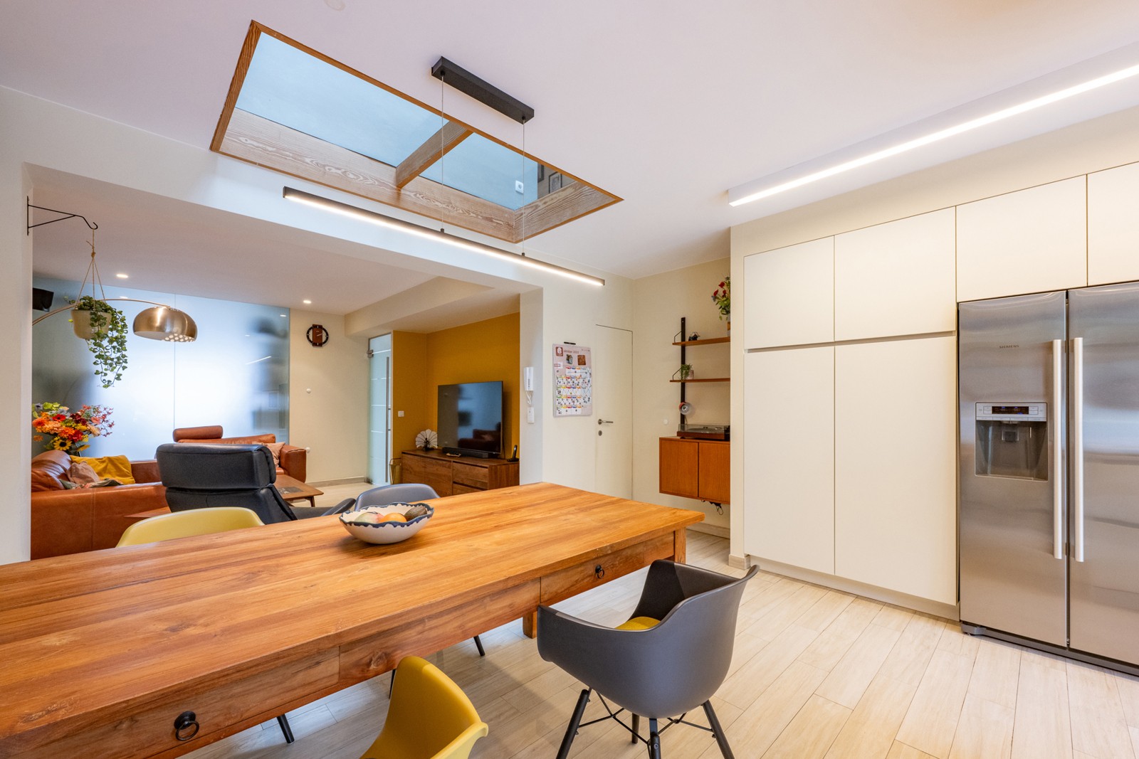 Ruime leefruimte met lichtkoepel voor extra daglicht.