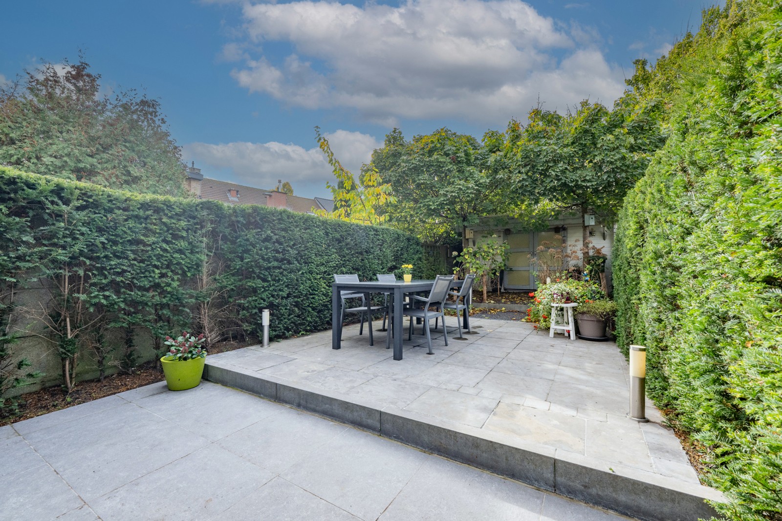 Zuidwestgerichte tuin met tuinhuis (2010), elektrische zonnescreens (2024) en zonneluifel (2024).