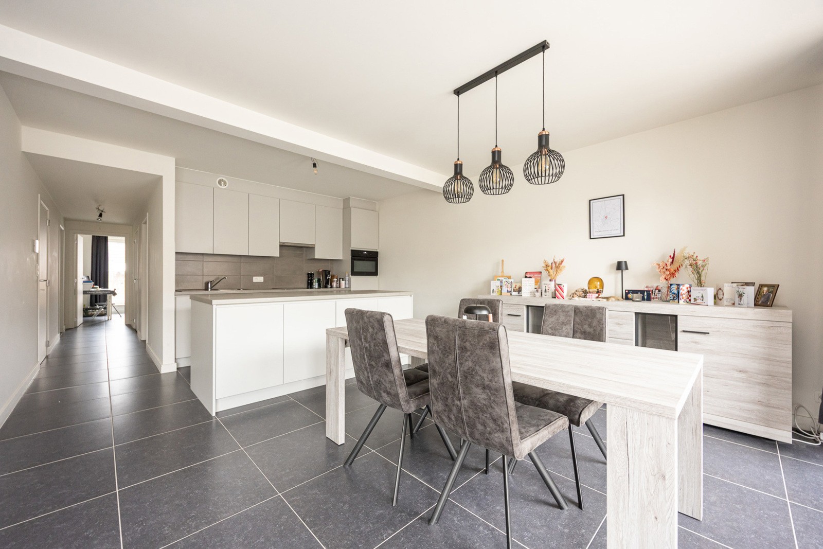 Open keuken met keukeneiland voorzien van de volgende toestellen nl. spoeltafel, keramische kookplaat, afzuigkap, koelkast met vriesvak, combi-oven en vaatwasmachine. Berging/wasplaats met aansluiting voor wasmachine/droogkast, uitgietbak, aardgasbrander van de C.V. en warmwater, zekeringenkast en omvoermer van de zonnepanelen. Badkamer voorzien van douchecel en badkamermeubel met dubbele lavabo. 2 slaapkamers (13m² en 12,7m²) die beiden toegang geven tot het terras.