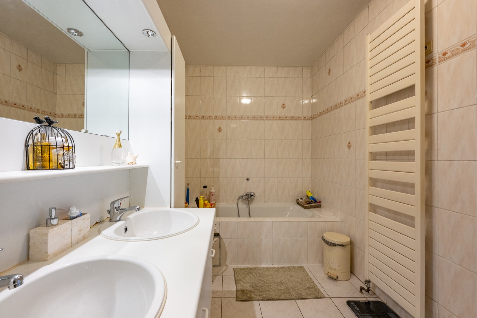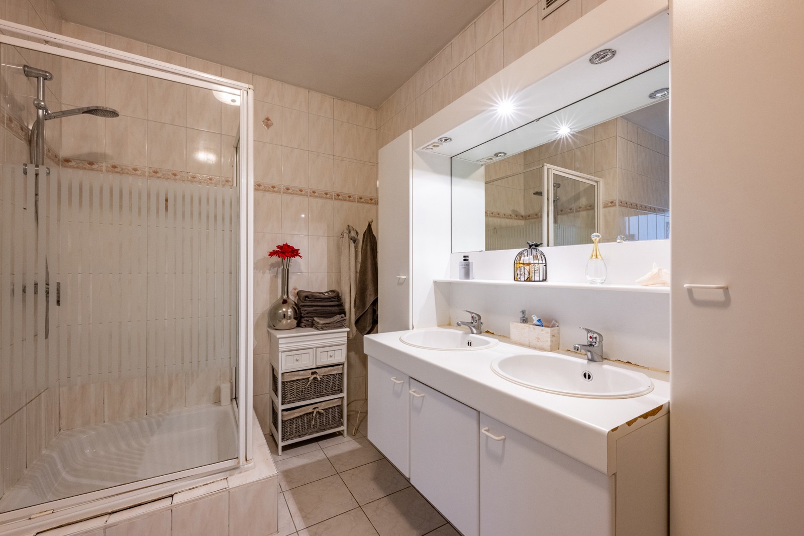 Badkamer met ligbad, douche en dubbele lavabo met meubel