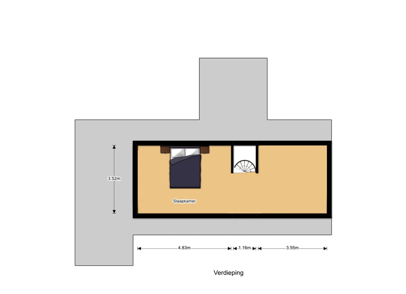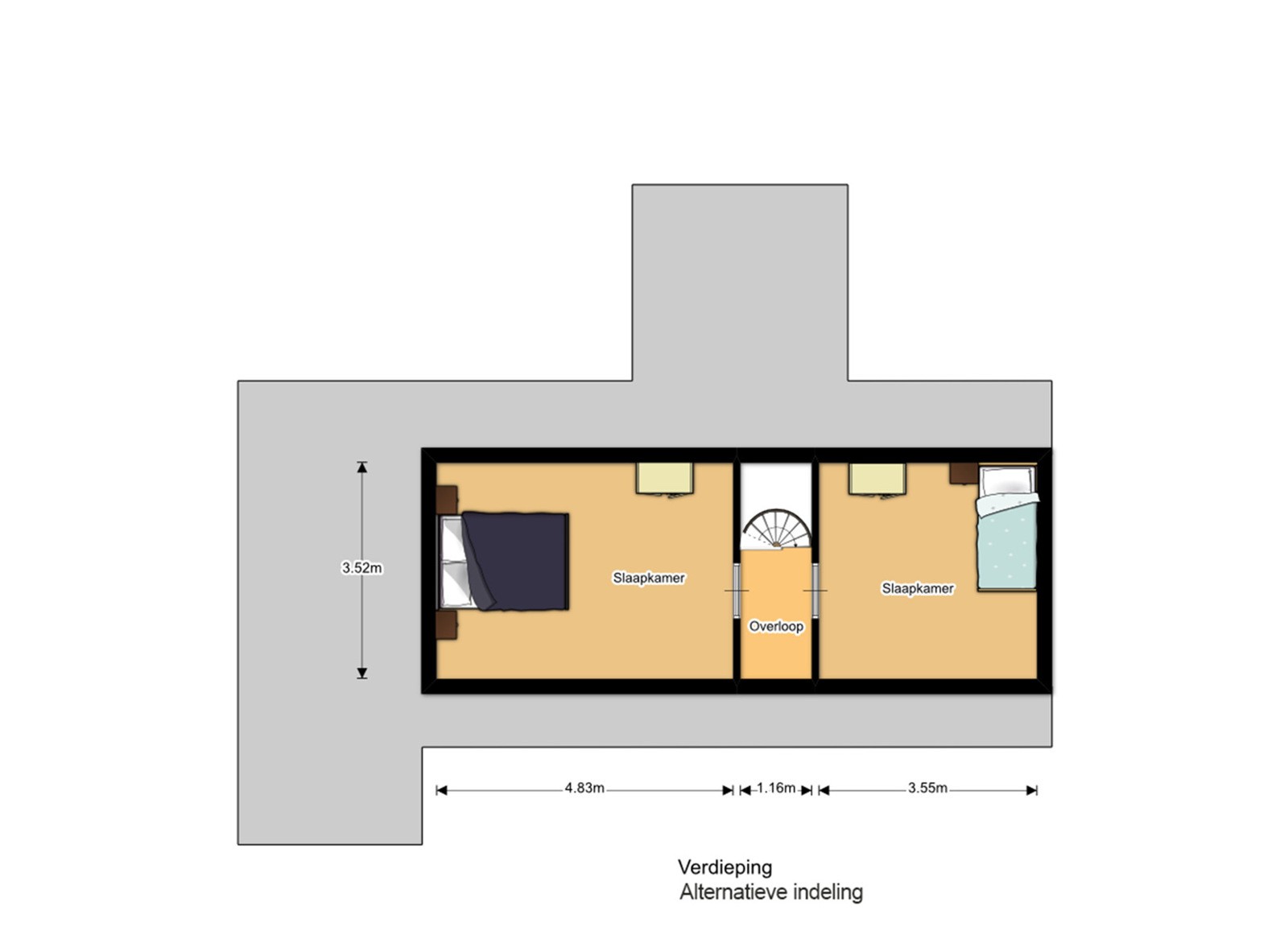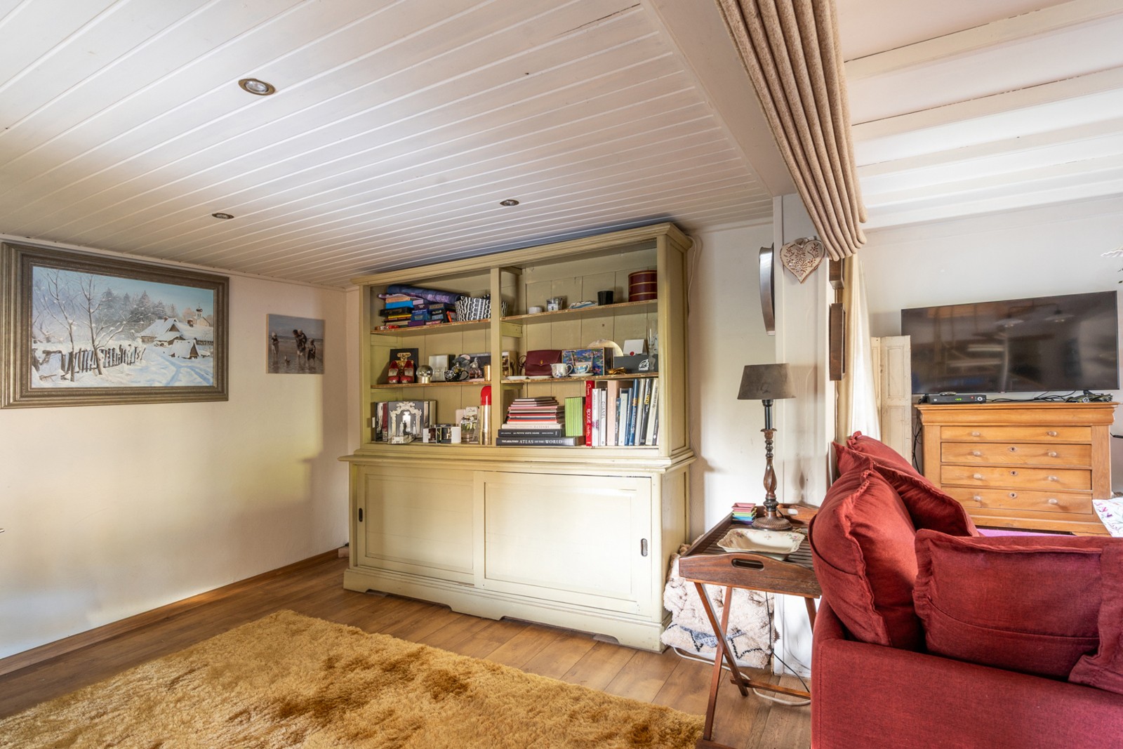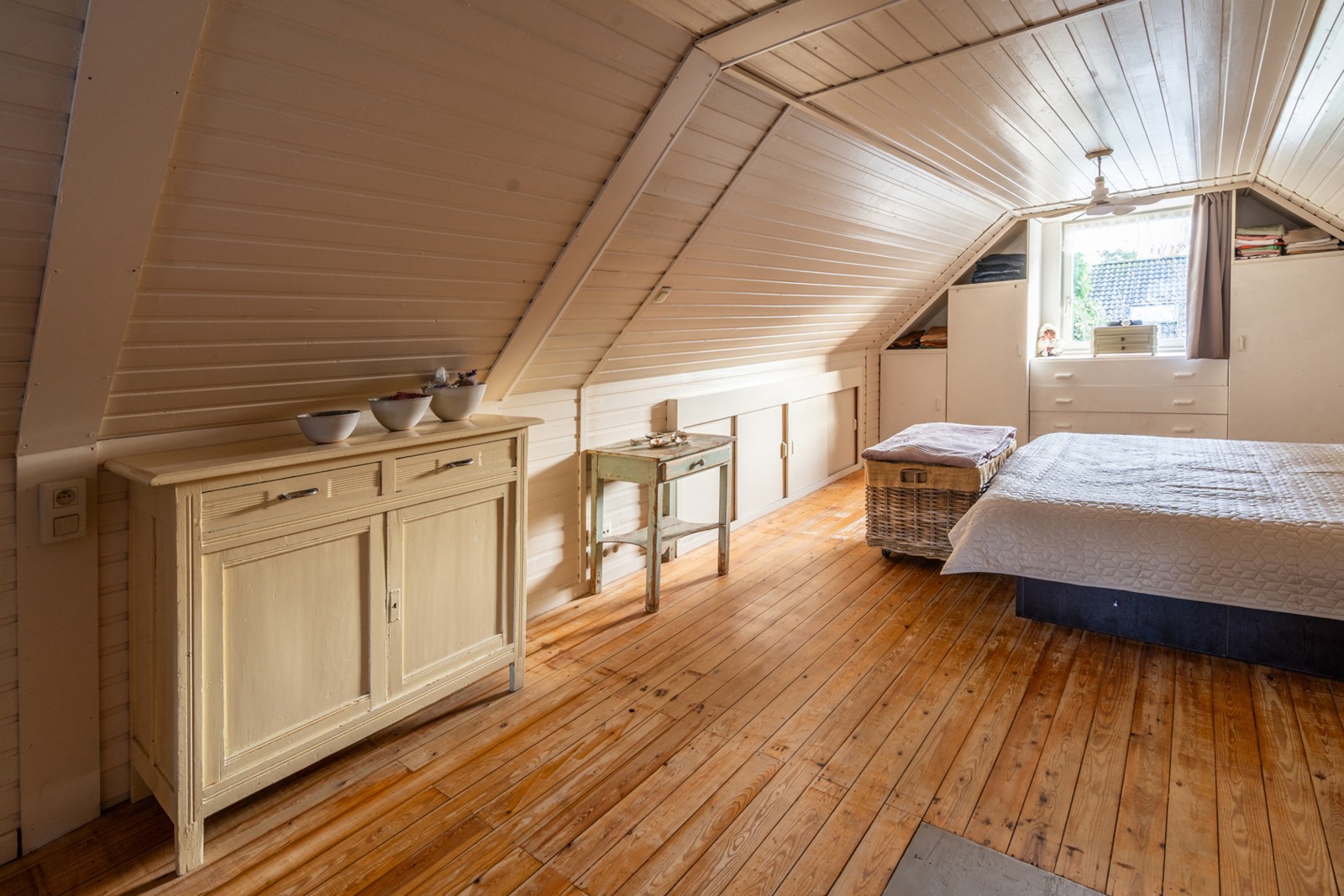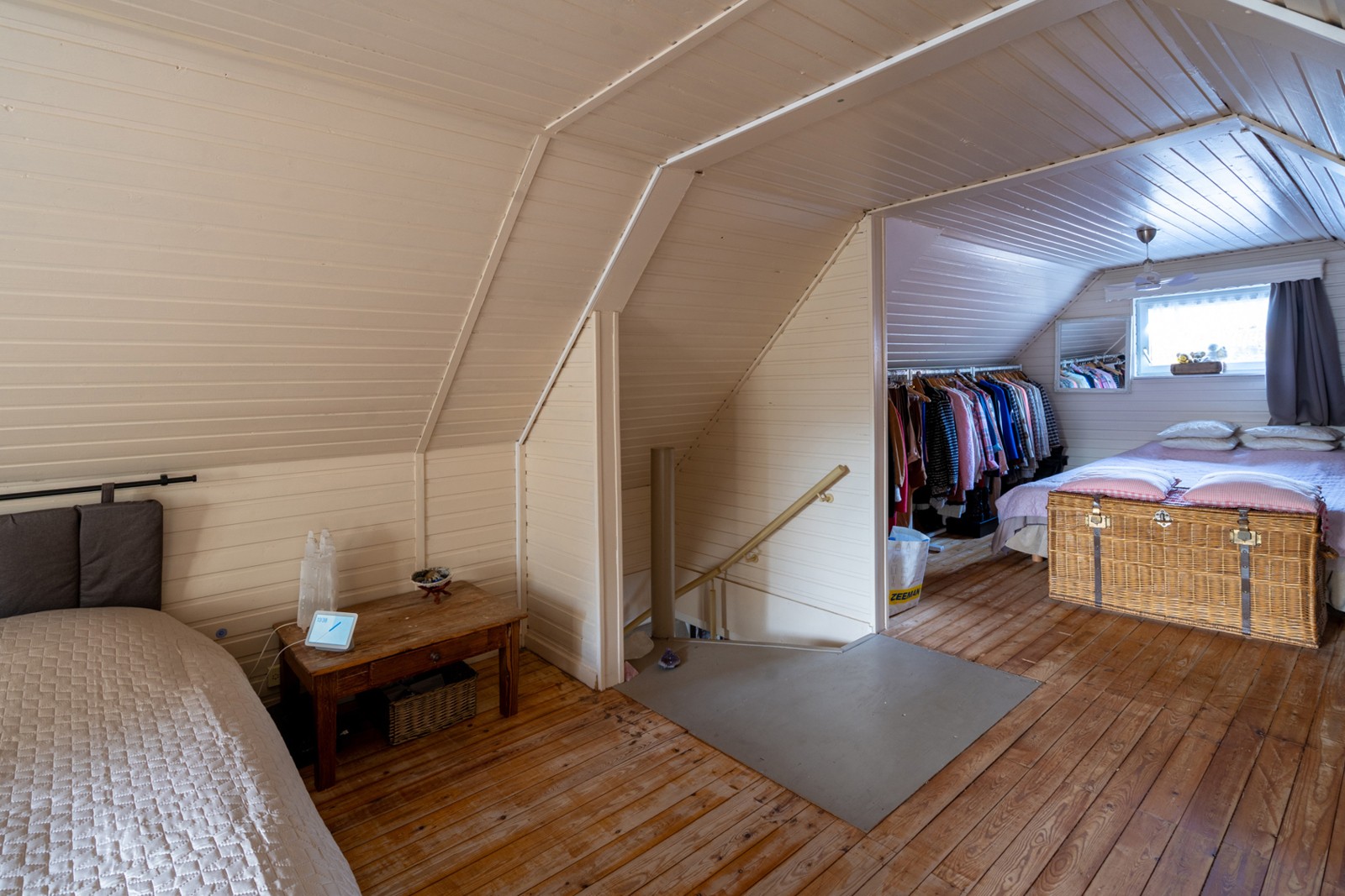 Vanuit de leefruimte heeft u toegang tot de eerste verdieping. Deze etage is momenteel ingericht als één riante slaapkamer van circa 30m² met dressing, wat zorgt voor een ruimtelijk gevoel. Slaapkamer en dressing strekken zich uit over de gehele verdieping. Indien gewenst is deze ruimte echter op eenvoudige wijze terug te vormen naar de oorspronkelijke indeling met twee aparte slaapkamers. Wie op zoek is naar nog meer volume of een andere uitstraling van de woning, kan de mogelijkheden bekijken om het huidige puntdak te vervangen door een plat dak, waardoor een volledig andere indeling realiseerbaar wordt.