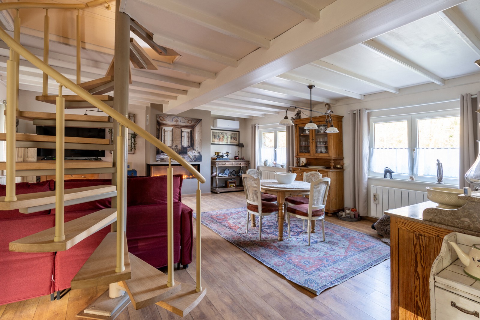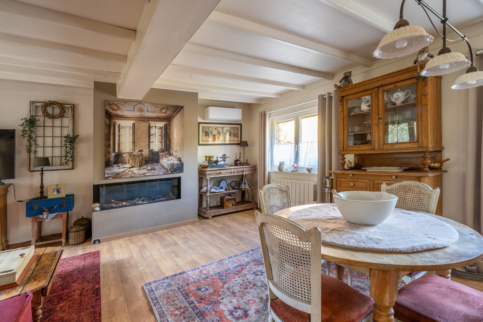 Bij het betreden van het pand komt u via de inkomhal terecht in de royale, sfeervolle leefruimte van circa 45m² die het hart van de woning vormt. De brede en moderne gashaard versterkt het aangename gevoel. Aansluitend bevindt zich de keuken van circa 7m² die praktisch is uitgerust en het landelijk karakter ondersteunt. De badkamer van circa 8m² is uitgerust met een lavabo in meubel, bad met douchecombinatie en het toilet.