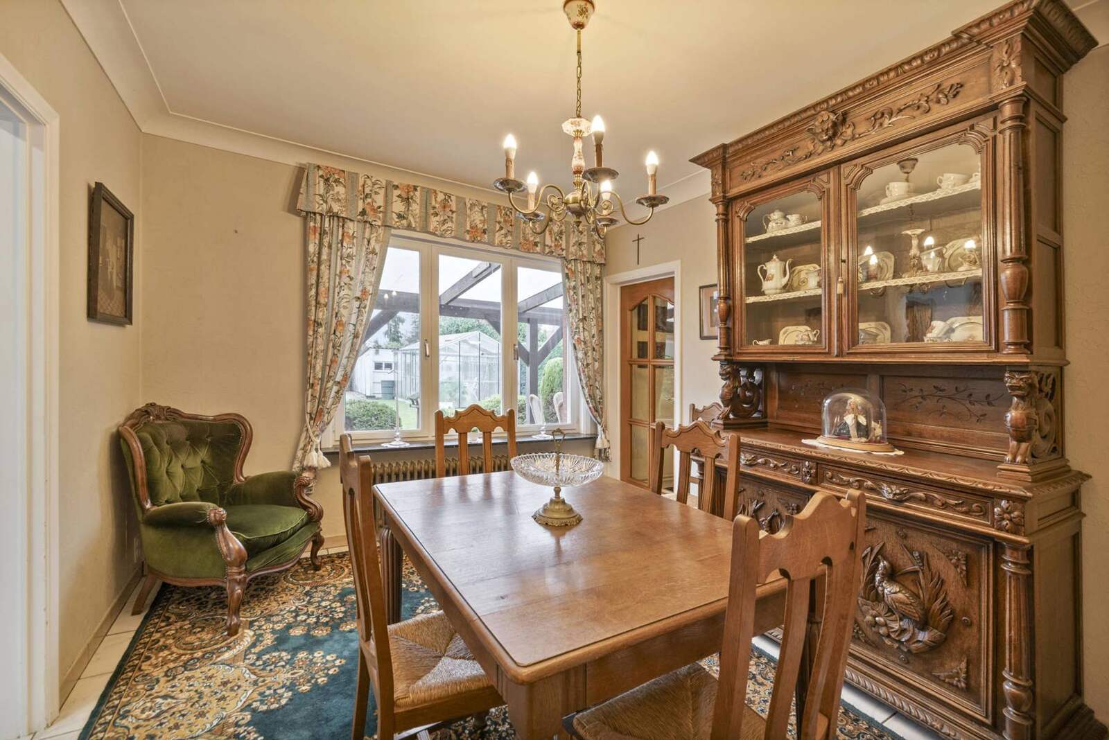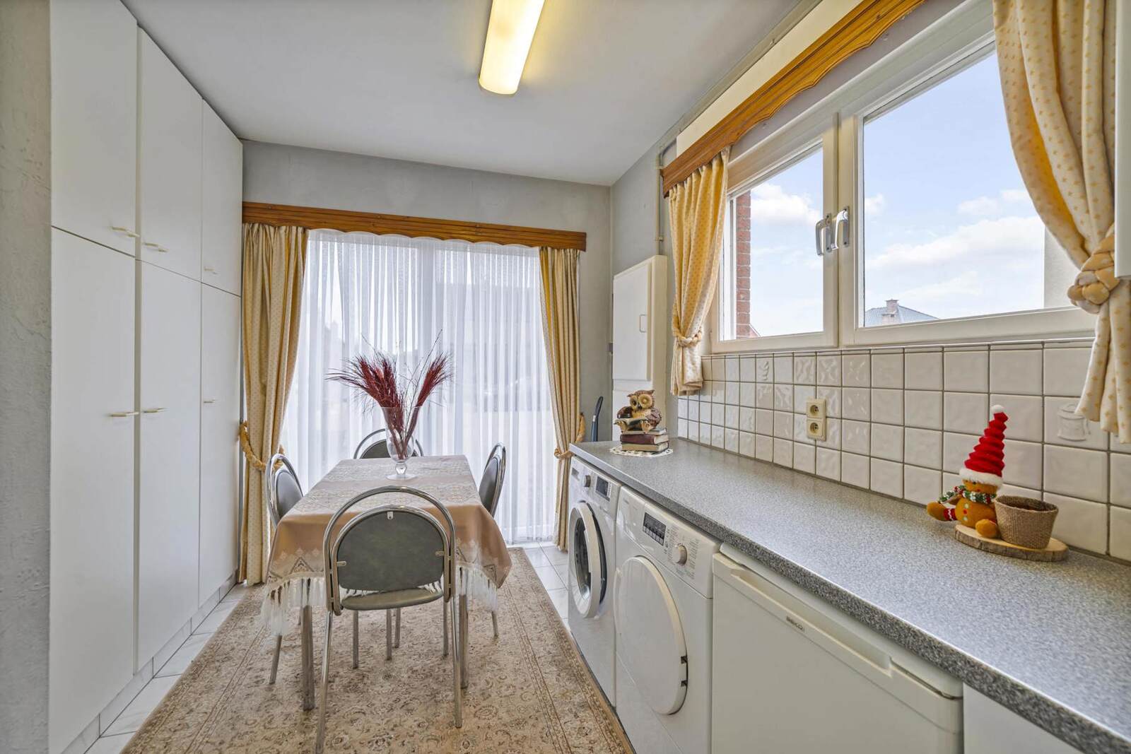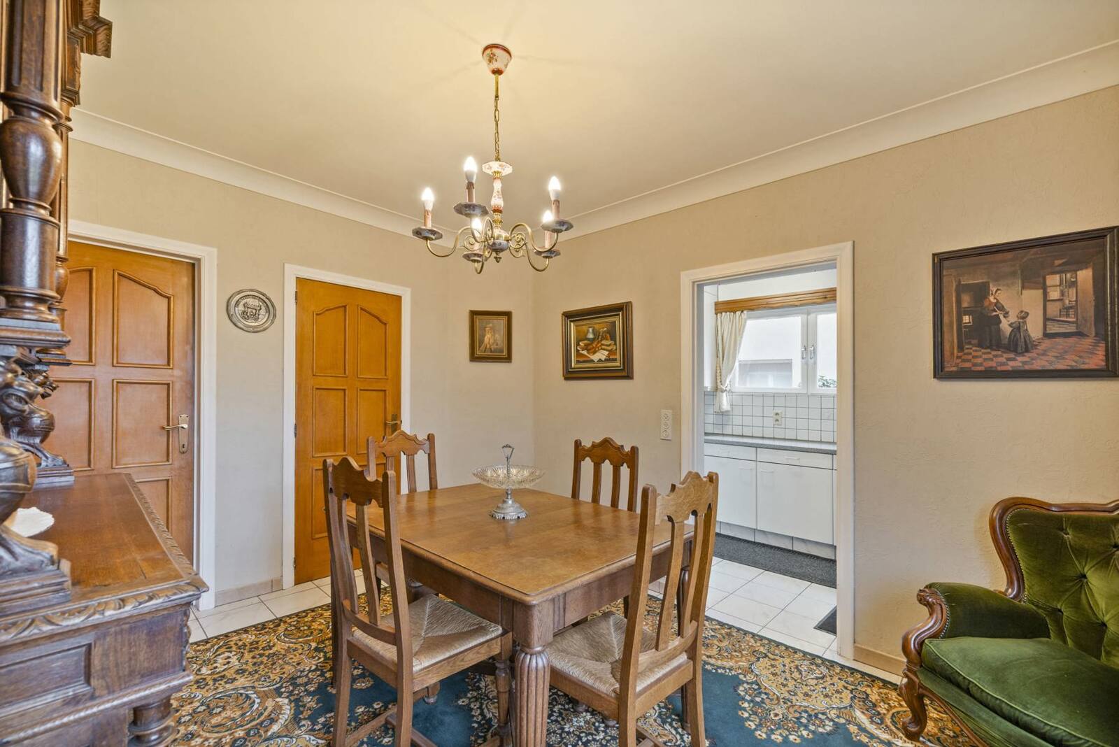 Achteraan is er een aparte eetkamer voorzien, dewelke leidt naar de keuken (16,93m²). Verder is er een apart toilet op het gelijkvloers.