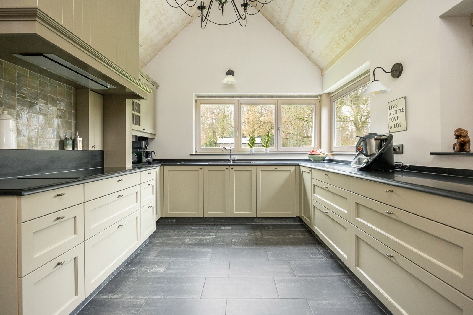 Aansluitend bevindt zich de open keuken, waar licht en zicht op de tuin centraal staan. De keuken is zeer ruim en hypergeïnstalleerd — een combinatie van comfort en duurzaamheid.