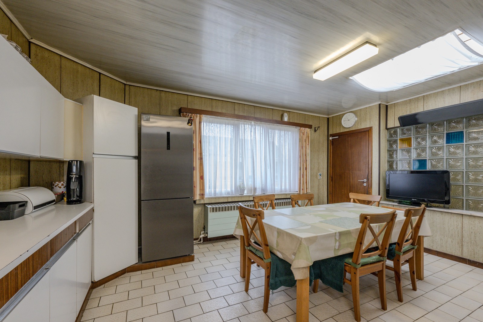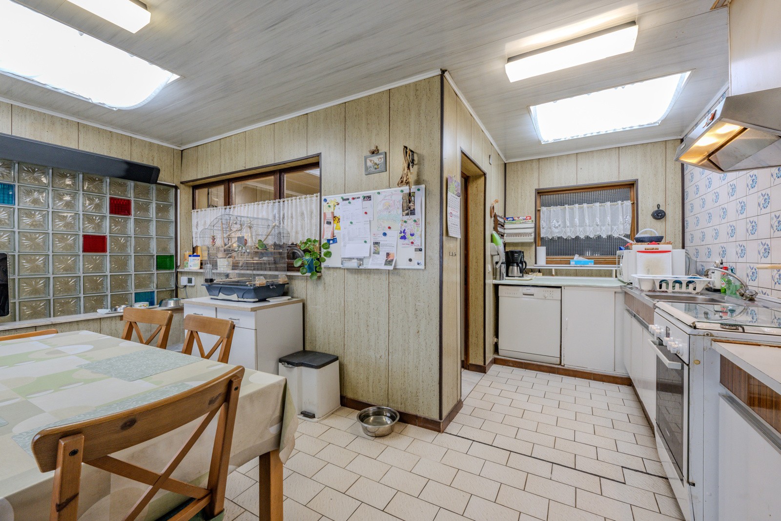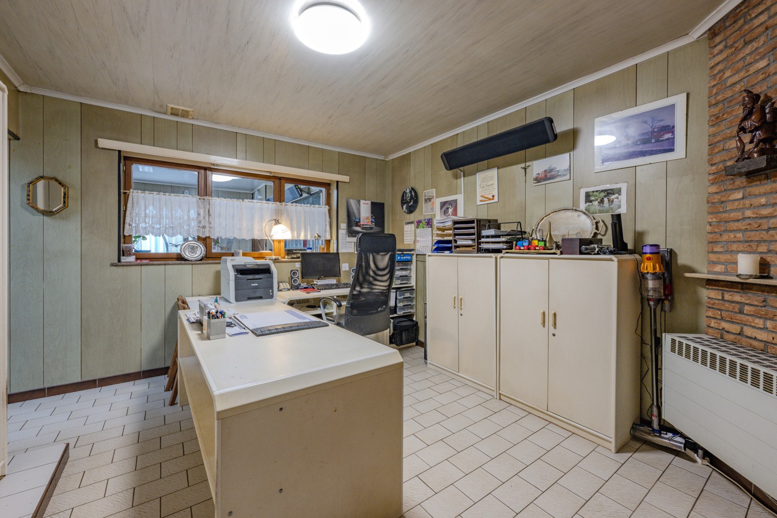 Aansluitend kantoorruimte met aan de achterzijde de grote keuken met de nodige kasten en toestellen.