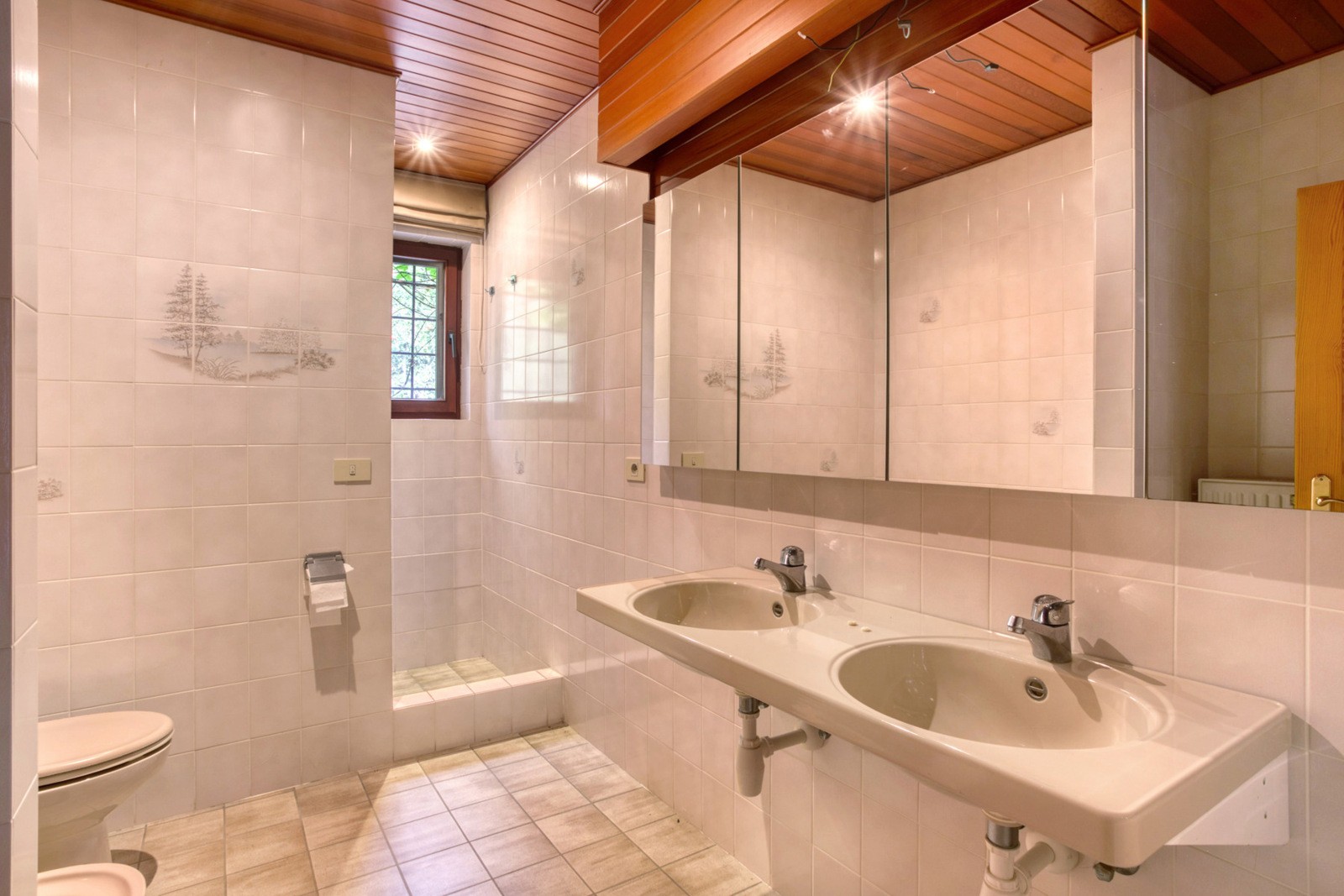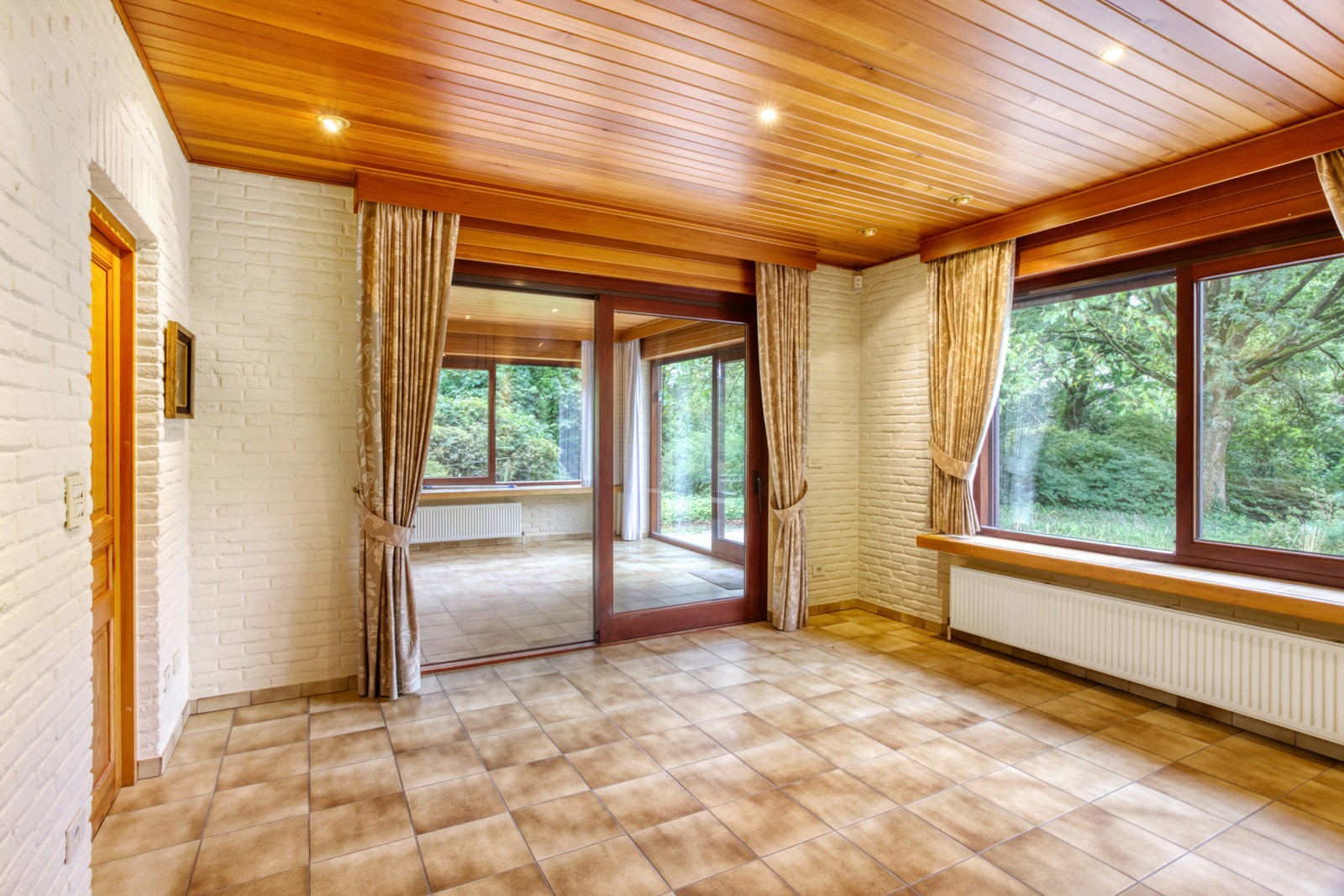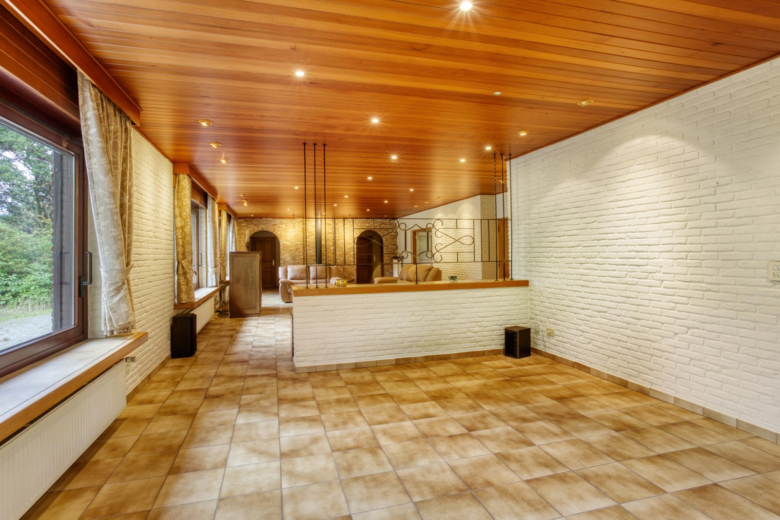 Een uitgestrekte private gebogen oprit brengt ons tot aan de villa met veel privacy. Deze is toegankelijk via een ruime inkomhal met toegang naar zowel de keuken, de woonruimte als tot de bureauruimte of extra slaapkamer. De zeer ruime woonkamer geeft een prachtig panoramisch zicht over de tuin met vijver door het gebruik van grote ramen achteraan. Deze ruimte is ook voorzien van een gezellige houtkachel.