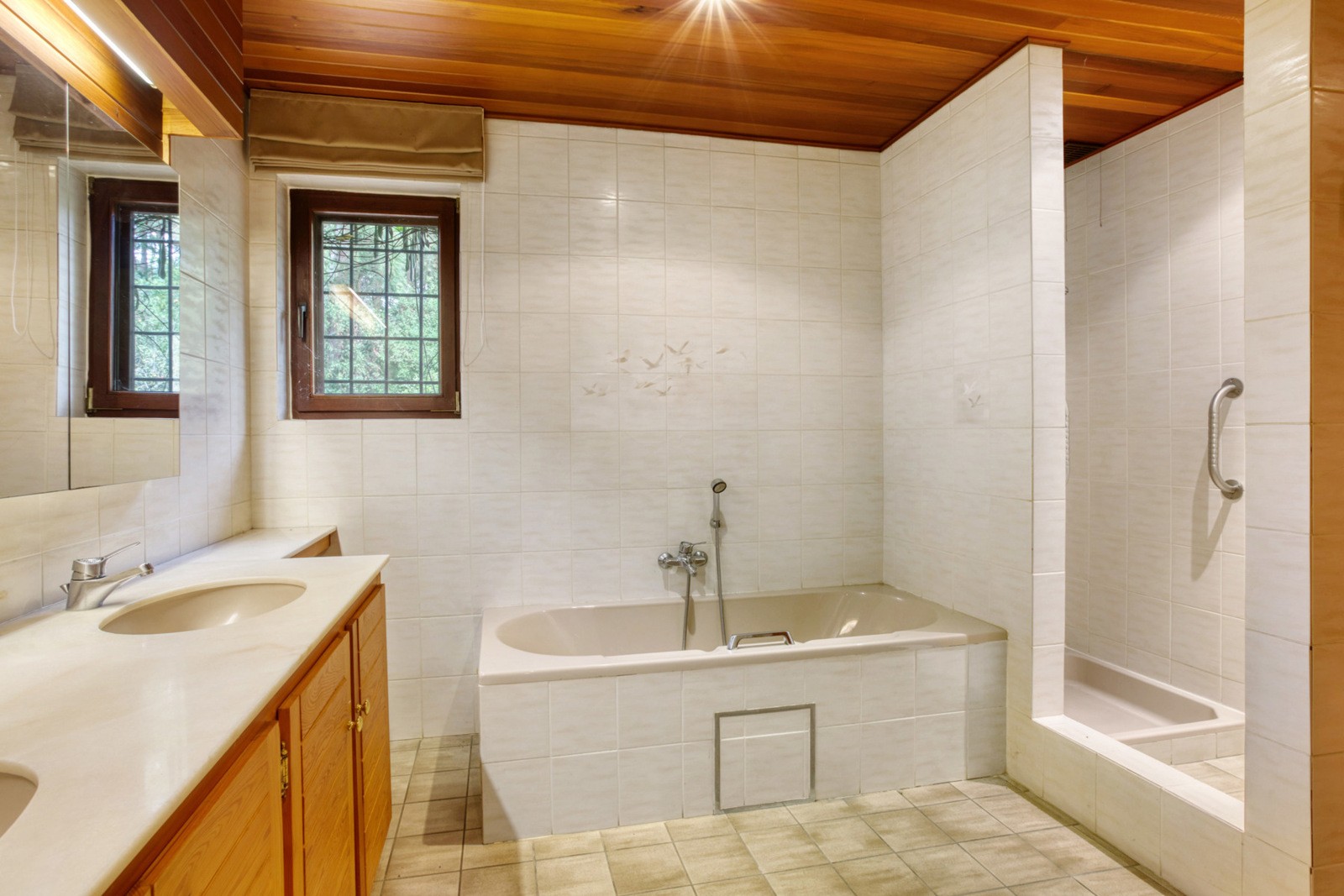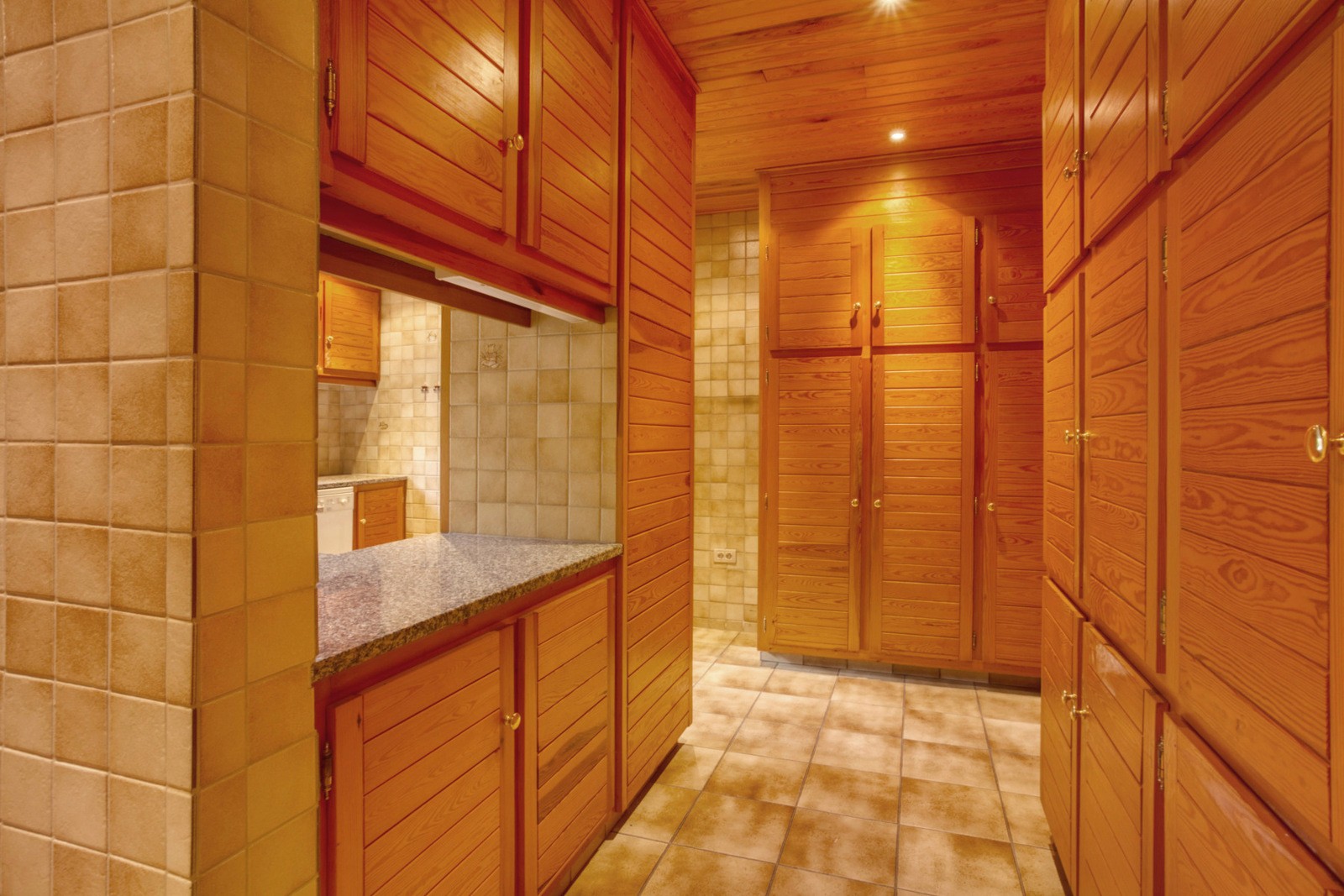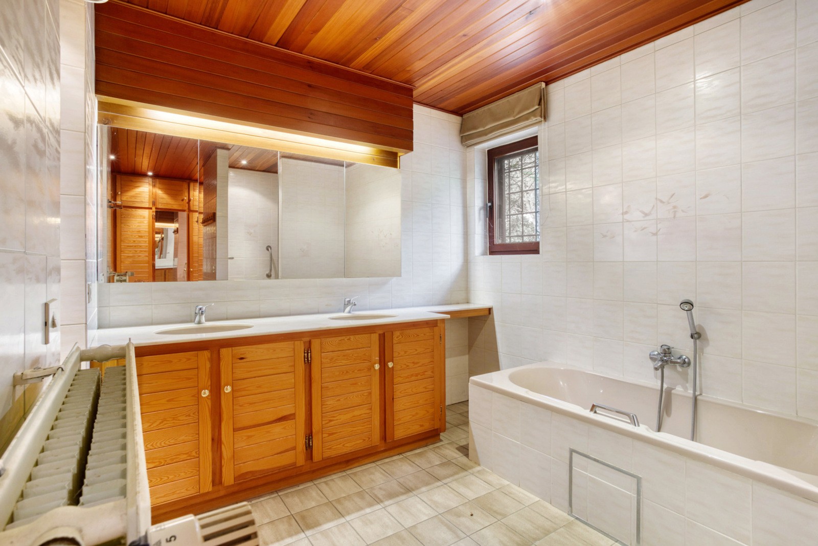 Een uitgestrekte private gebogen oprit brengt ons tot aan de villa met veel privacy. Deze is toegankelijk via een ruime inkomhal met toegang naar zowel de keuken, de woonruimte als tot de bureauruimte of extra slaapkamer. De zeer ruime woonkamer geeft een prachtig panoramisch zicht over de tuin met vijver door het gebruik van grote ramen achteraan. Deze ruimte is ook voorzien van een gezellige houtkachel.