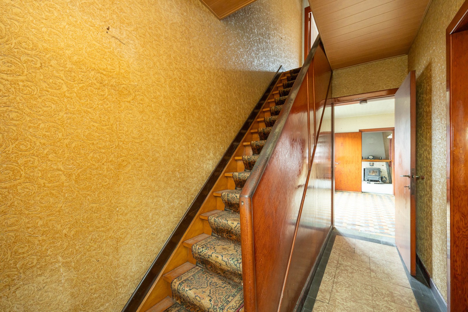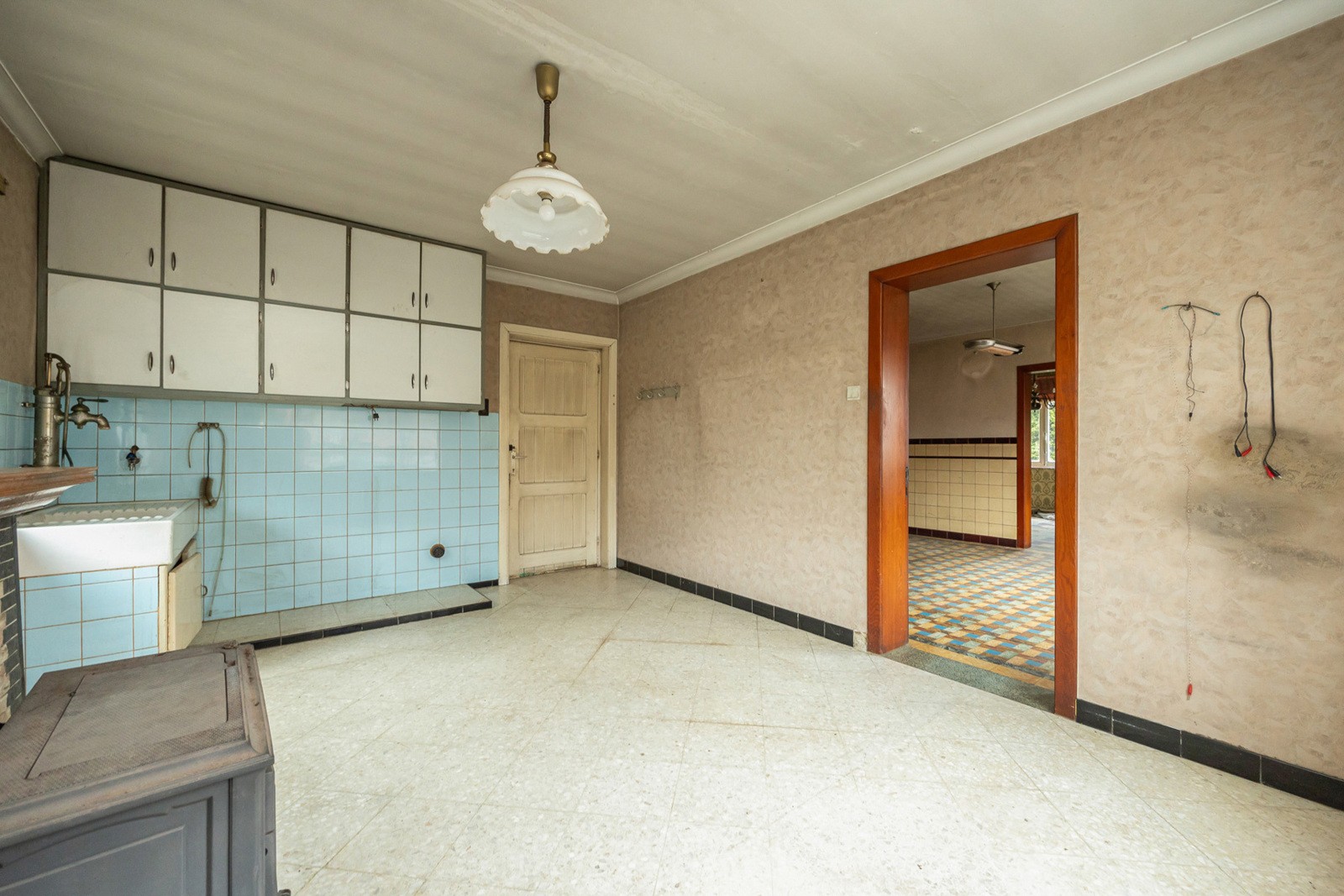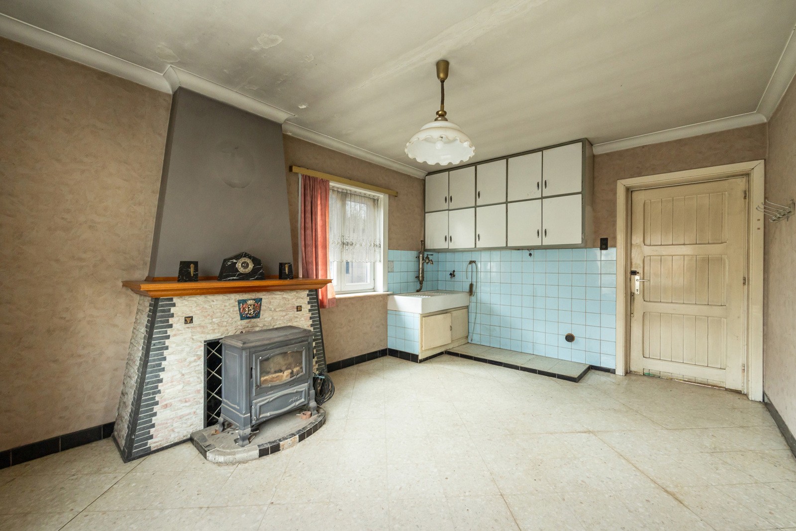 Inkomhal 7 m² op tegel. Leefruimte 20,5 m² op tegel met mazoutkachel. Voorplaats 12 m² op tegel. Keuken 18 m² op tegel.
