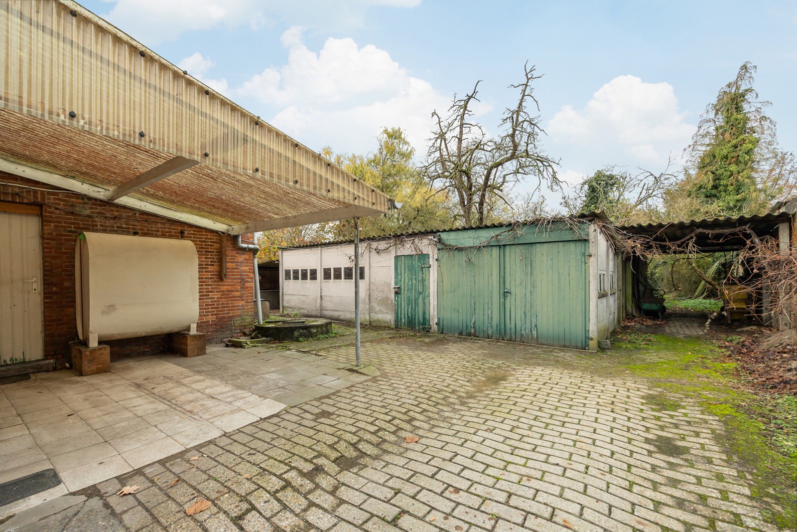 Tuin met externe garage 15 m² en tuinberging 25 m² op beton.