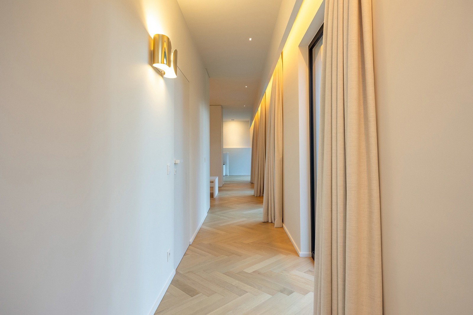 Op de eerste verdieping komt u terecht op een bijzonder ruime overloop van 30 m², afgewerkt met elegant visgraatparket, dat de verdieping een warme en luxueuze uitstraling geeft. De wasplaats van 7 m² is praktisch ingericht met aansluitingen voor wasmachine en droogkast.