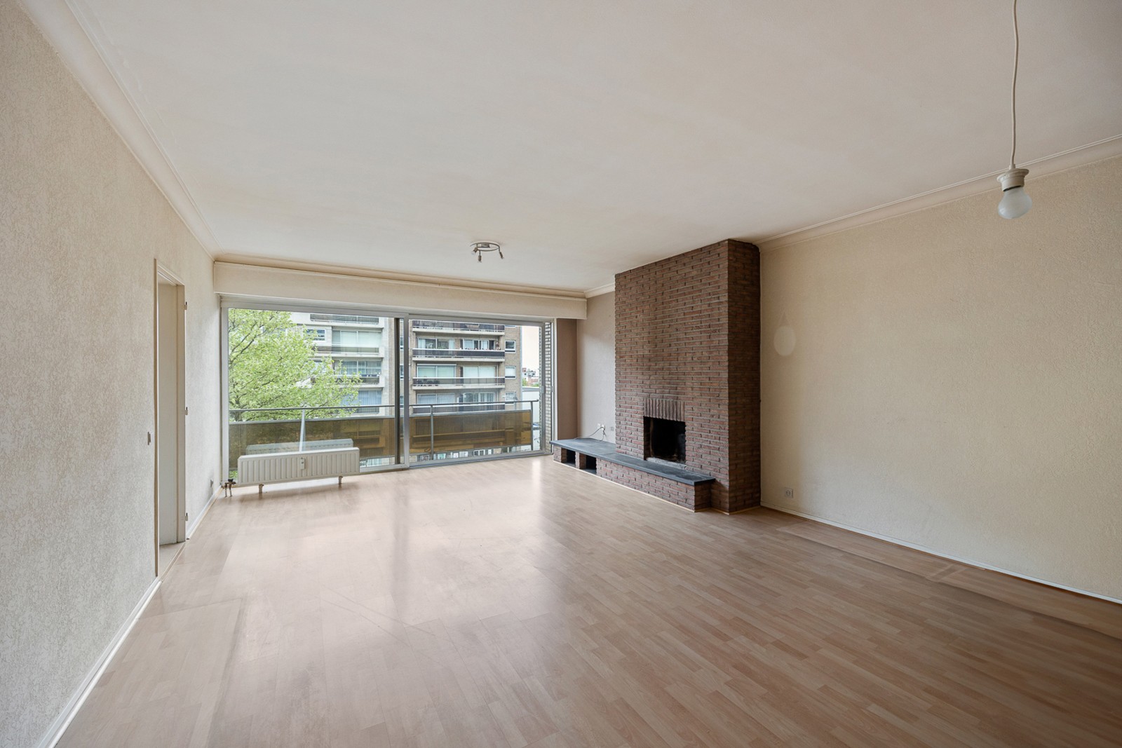 Ruime woonkamer van ca. 40 m² op laminaatvloer, met functionele open haard