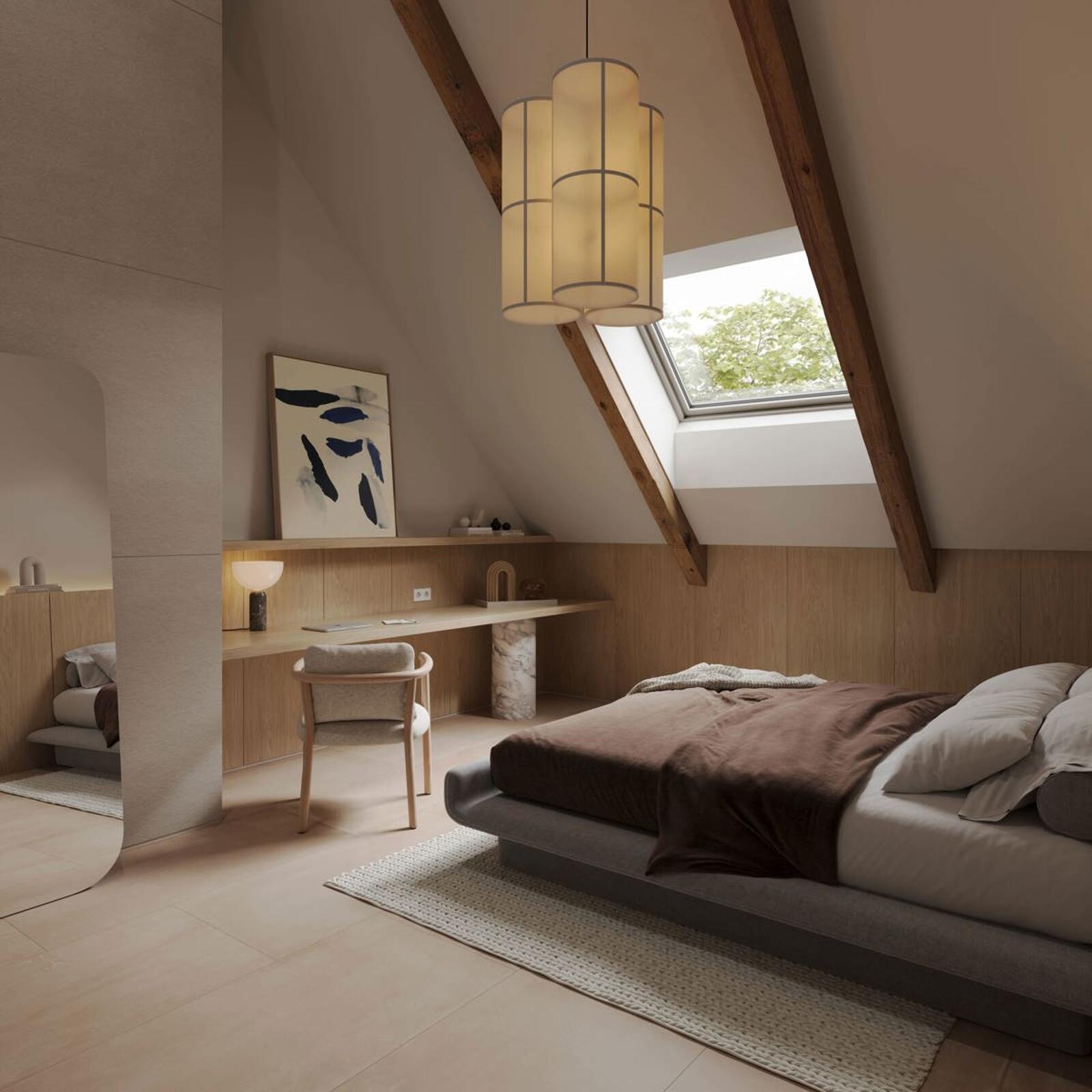 De tweede verdieping is bereikbaar via een vaste trap en omvat twee extra slaapkamers, een technische berging en een badkamer met inloopdouche en wastafel.
